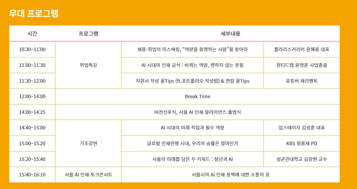 서울시와 서울경제진흥원(SBA)에서 운영하는 '청년취업사관학교(새싹, SeSAC)'가 주최하는 행사로 글로벌 유망 기업 현직자 멘토링, 자소서/면접 꿀팁 특강까지, 현직자 네트워킹과 트렌드 인사이트를 얻을 유일무이한 기회!