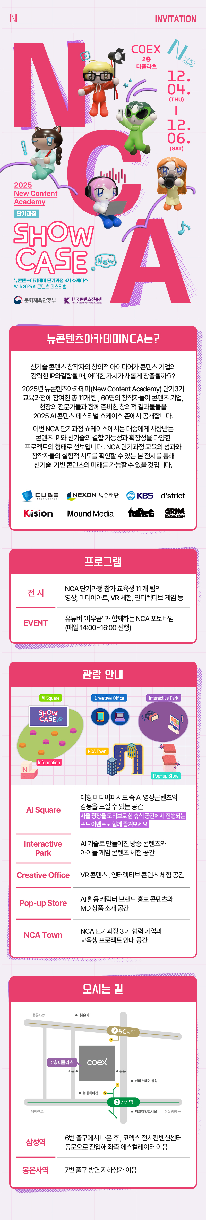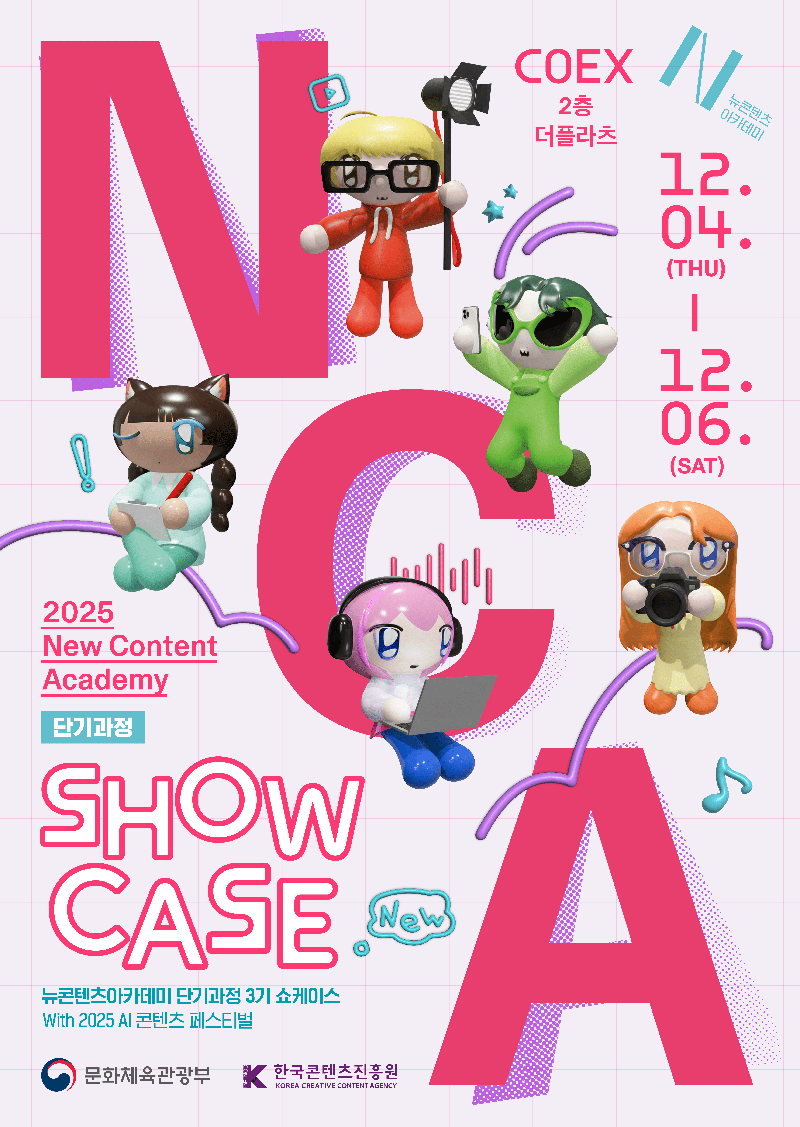 2025년 뉴콘텐츠아카데미(New Content Academy) 단기 3기 교육과정에 참여한 총 11개 팀, 60명의 창작자들이 콘텐츠 기업, 현장의 전문가들과 함께 준비한 창의적 결과물들을 2025 AI 콘텐츠 페스티벌 쇼케이스 존에서 공개합니다.