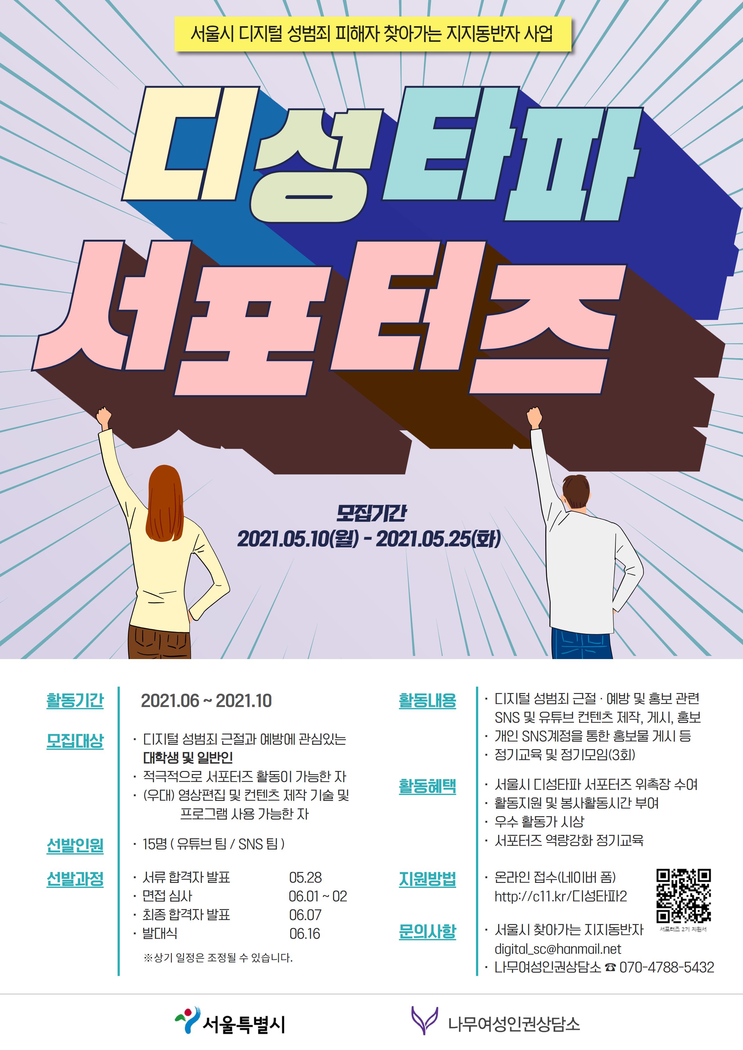 '디성타파 서포터즈'는 서울시 디지털 성범죄 피해자 지원 사업인 '찾아가는 지지동반자'에서 진행되는 프로그램입니다. ‘디성타파 서포터즈’는 디지털 성범죄의 피해 예방과 관련된 정보를 공유하고 피해자가 '찾아가는 지지동반자'를 통해 지원을 받을 수 있다는 것을 알리는 홍보대사로 활동하게 됩니다. 디지털 성폭력 근절 및 예방에 열정과 관심이 가득한 대학생 및 일반인분들의 많은 지원 바랍니다.