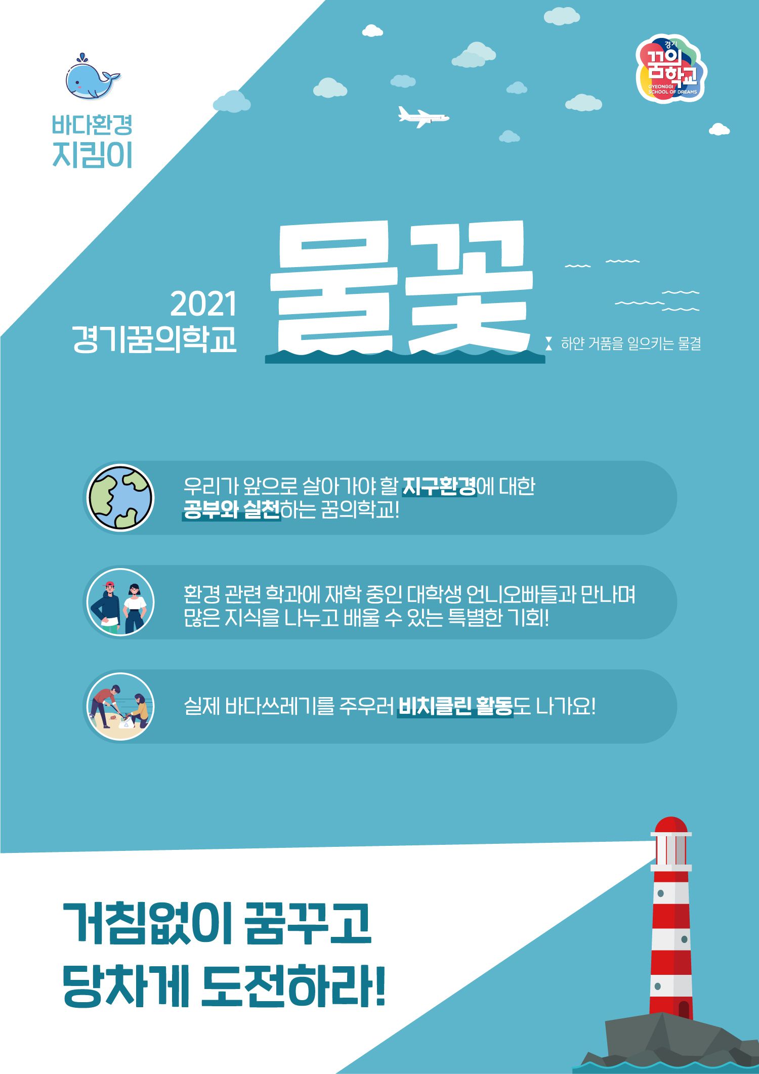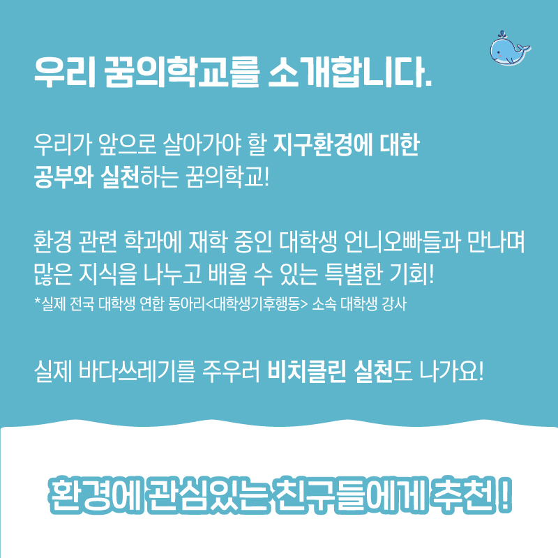캠페인 활동, 비치클린, 비치코밍 활동 등 바다를 살리기 위해 직접 활동하는 꿈의학교입니다!