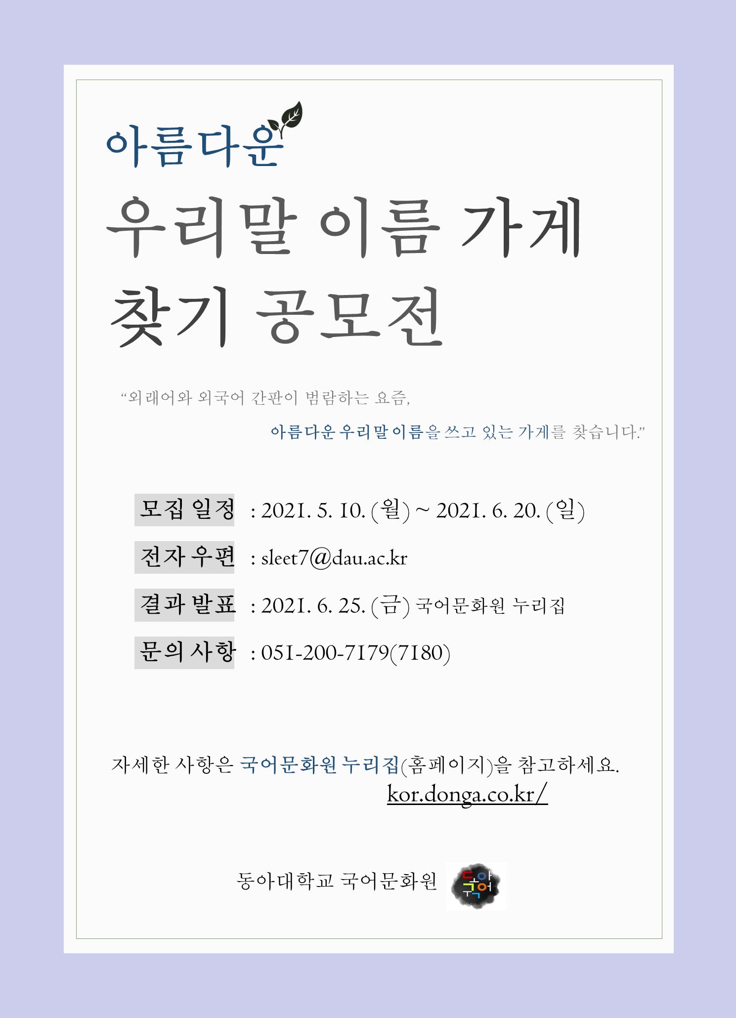 안녕하십니까? 동아대학교 국어문화원에서는 외래어와 외국어 간판이 범람하는 요즘,