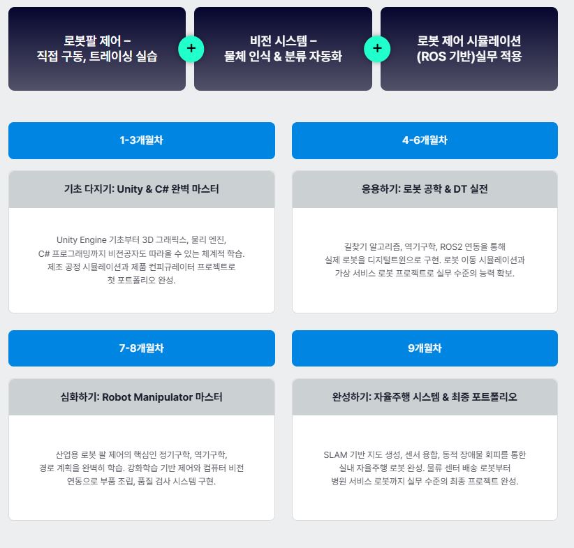 본 과정은 Unity 기반 시뮬레이션 구축 → ROS2 연동 → 로봇 제어 및 디지털트윈 구현 → 프로젝트 결과물 완성까지 이어지는 단계형 실습 구조로 구성되어 있습니다. 단순 이론 전달을 넘어, 실제 로봇 및 자동화 환경을 가상으로 생성하고 제어할 수 있는 수준까지 학습하는 것을 목표로 합니다.