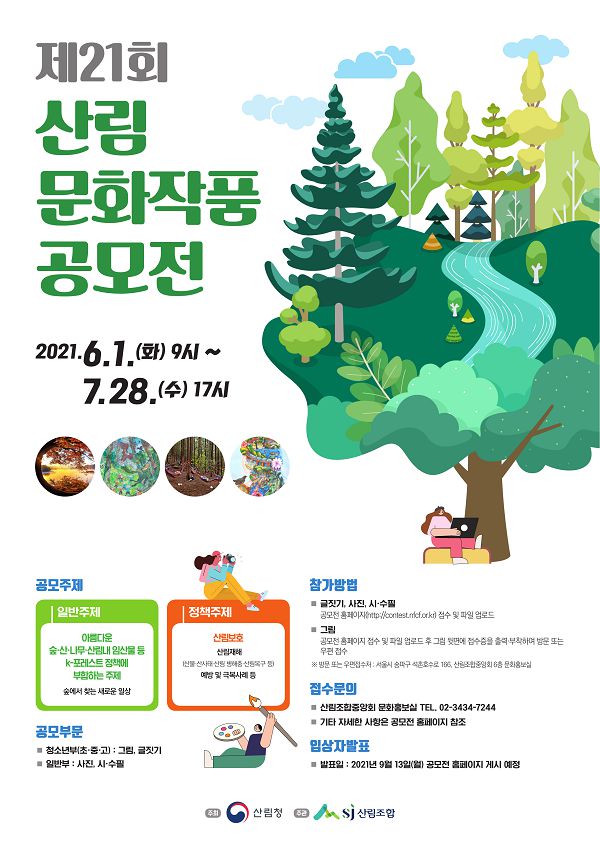 · 공식 홈페이지(contest.nfcf.or.kr)를 통한 이미지 업로드 후 접수증을 출력, 그림 뒷면에 부착하여 실물 우편 또는 방문 접수 (업로드한 이미지 파일은 1차 심사에 활용됨) · 접수처 : (05601) 서울특별시 송파구 석촌호수로 166 산림조합중앙회 문화홍보실 ☎ 02) 3434-7244 |