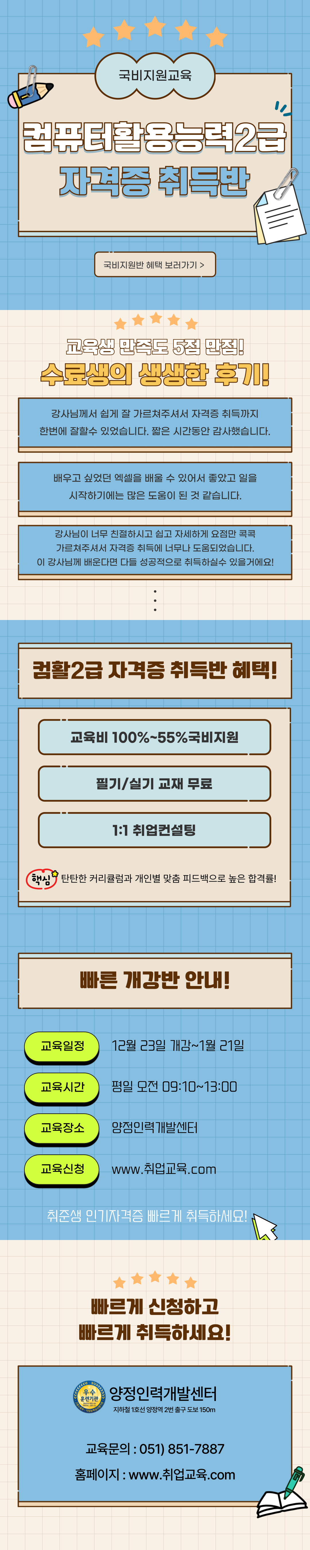 [국비지원/20일 완성] 컴퓨터활용능력2급 자격증 단기취득반(필기/실기)