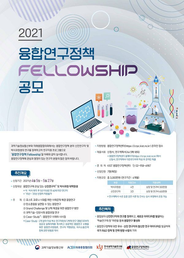 과학기술정보통신부와 융합연구정책센터에서는 융합연구정책 분야 신진연구자 및 박사과정생의 연구를 장려하고자 연구지원 프로그램으로 ‘융합연구정책 Fellowship’을 아래와 같이 실시합니다. 융합연구정책에 관심과 열정이 있는 연구자 분들의 많은 참여 바랍니다.