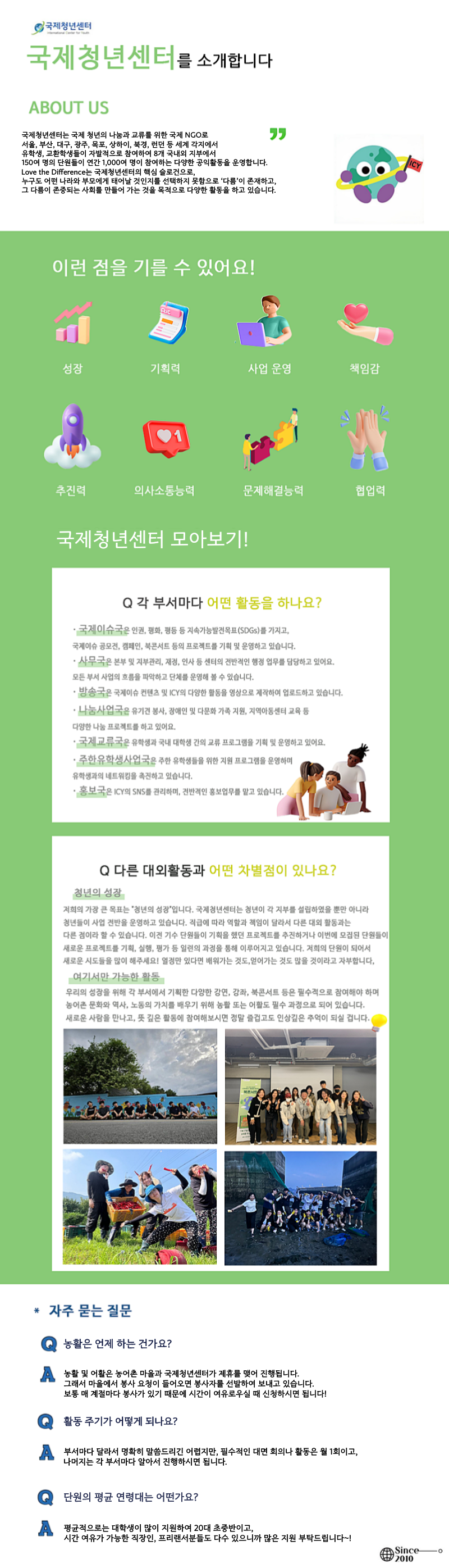 국제청년센터는 국제 청년의 나눔과 교류를 위한 국제 NGO로, 서울, 부산, 대구, 광주, 상하이, 북경, 런던 등 세계 각지에서 유학생과 대학생이 자발적으로 참여하며 8개 국내외 지부에서 약 150명의 단원이 연간 1,000여 명이 참여하는 다양한 공익활동을 전개하고 있습니다.