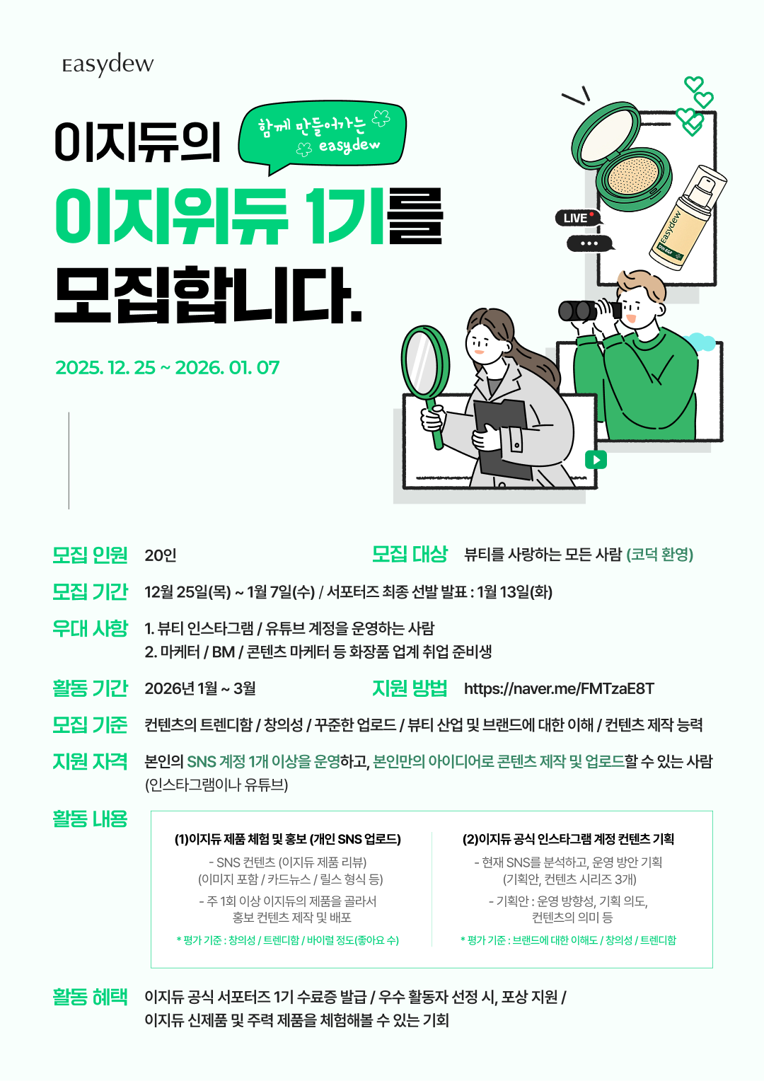 피부 과학의 원칙을 지키는 이지듀, 이제, 그 진짜 변화를 함께 추적할 서포터즈 – 이지위듀 1기를 모집합니다.