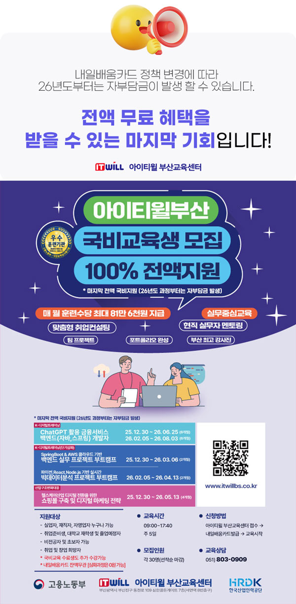 12월 30일 개강되는 아이티윌 부산교육센터 과정이 마지막! 100% 국비무료교육입니다~!