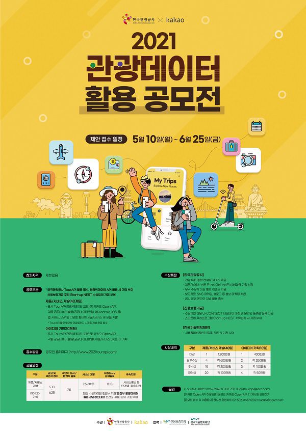 - 공사 TourAPI(관광빅데이터 포함) 및 카카오 Open API, 각종 공공데이터 활용(공공데이터포털), 앱(Android, IOS 등), 웹 서비스, SW 등 다양한 형태의 제품/서비스 및 모듈 개발 * TourAPI 활용 및 2차 마감일까지 시제품 개발 완료 필수 |