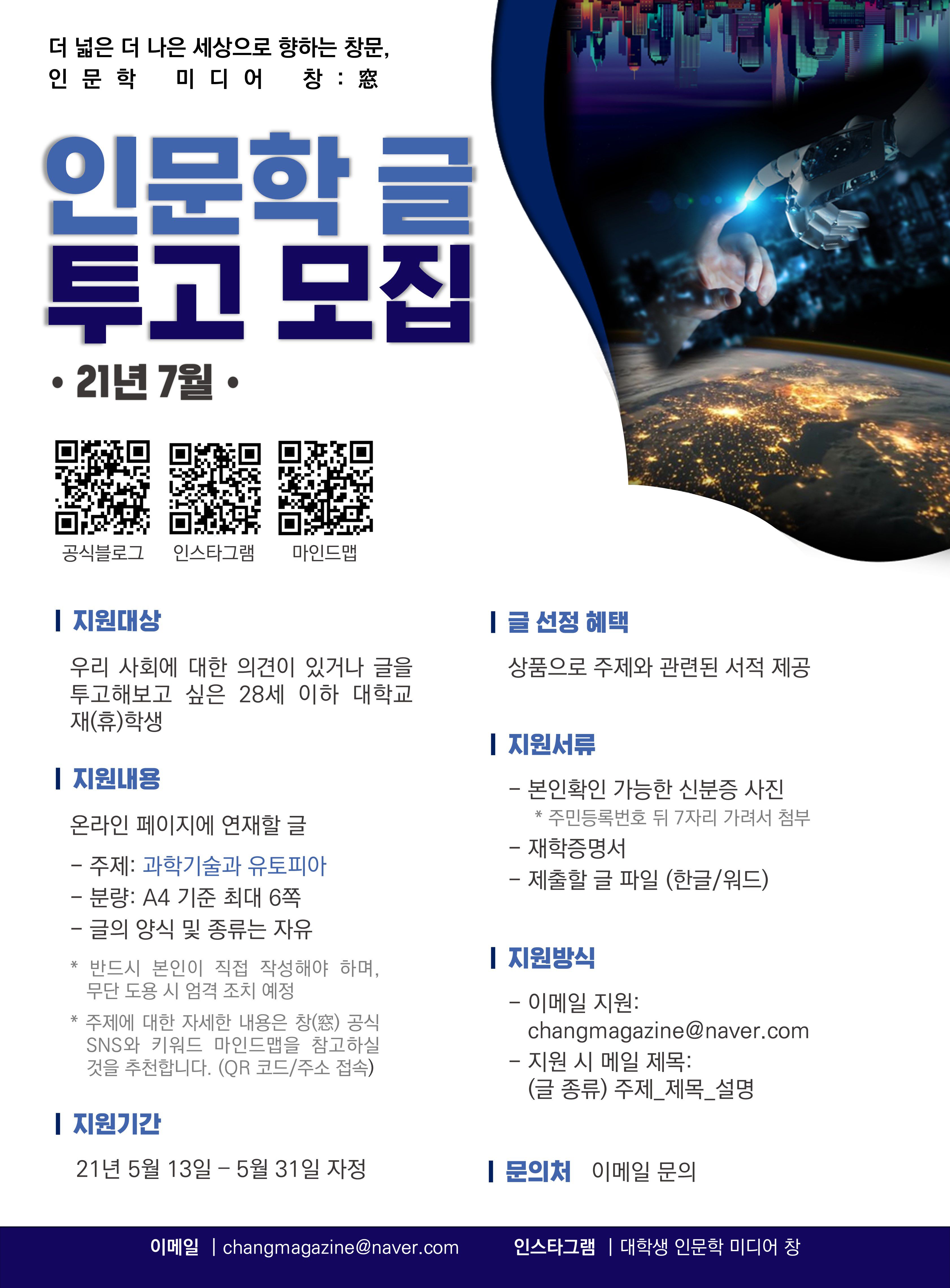대학생들의 인문학 미디어 '창(窓)'에서 21년 7월에 온라인 잡지에 연재할 글을 투고받습니다.
