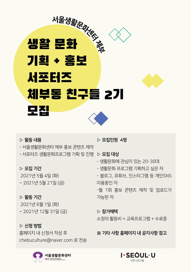 서울생활문화센터 체부 생활문화 서포터즈 <체부동 친구들 2기>를 모집합니다.