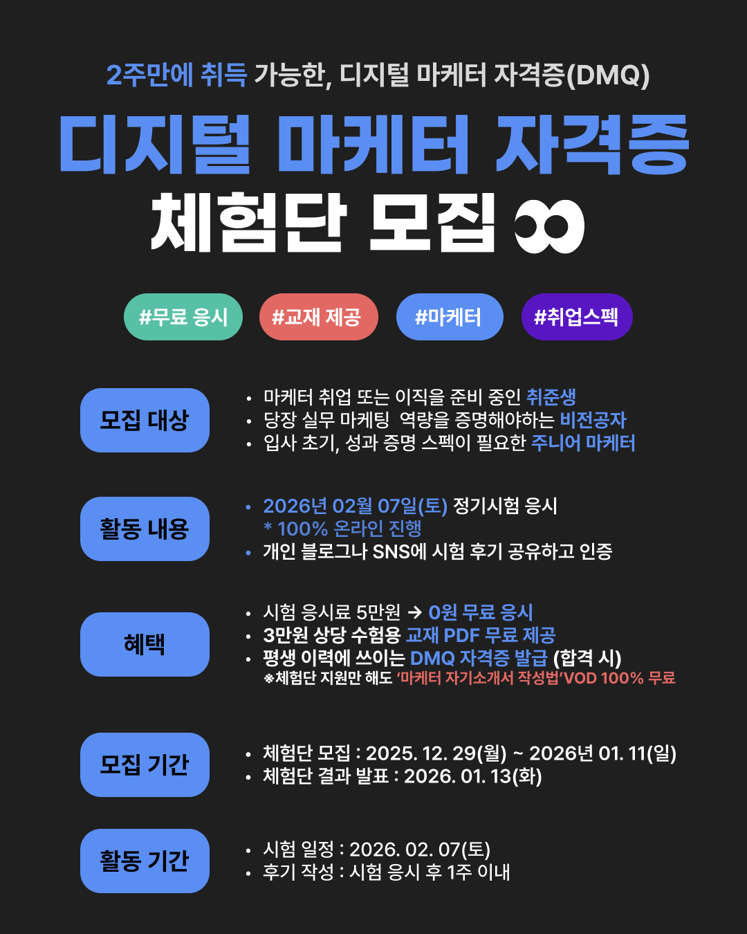 👉 디지털 마케터 자격증(DMQ) 체험단으로 무료 응시하고, 자격증까지 가져가세요