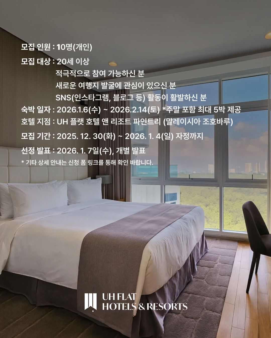 말레이시아에 새롭게 오픈한 'UH 플랫 호텔 앤 리조트'에서 여행의 여유와 함께 콘텐츠를 작성해주실 수 있는 분들을 모집합니다. (유의사항 필독)