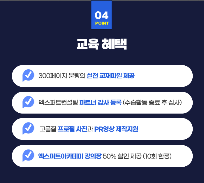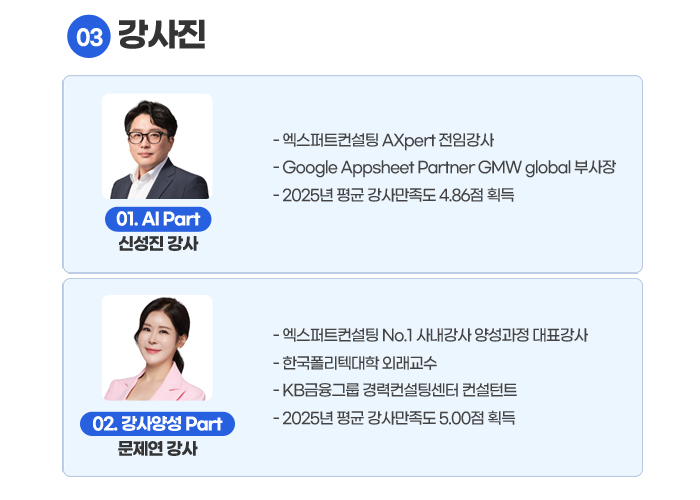 1. 신청기간 : 2026.01.08(목) ~ 01.16(금) 16시까지 1) 심사방식 및 일정 : 1차(서류심사 01.19) < 2차(면접심사 01.20(송파러닝센터) < 최종합격자 발표 2) 선발인원 : 총 10명 선발 (소수정예 Class 운영) 2. 교육기간 : 2026.01.23(금) ~ 01.28(수) , 5일 32시간 과정 3. 교육장소 : 엑스퍼트아카데미 강남 러닝센터 (2호선 삼성역 4번출구, 도보 5분) * 주차지원이 불가능 합니다. 대중교통을 이용해 주세요. 4. 교육비 : 300만원 << 30만원 (성과연계형 지원과정) 5. 신청방법 : 엑스퍼트아카데미 홈페이지 수강신청 6. 문의 : 엑스퍼트아카데미 / 02-2152-3915 / open@exc.co.kr