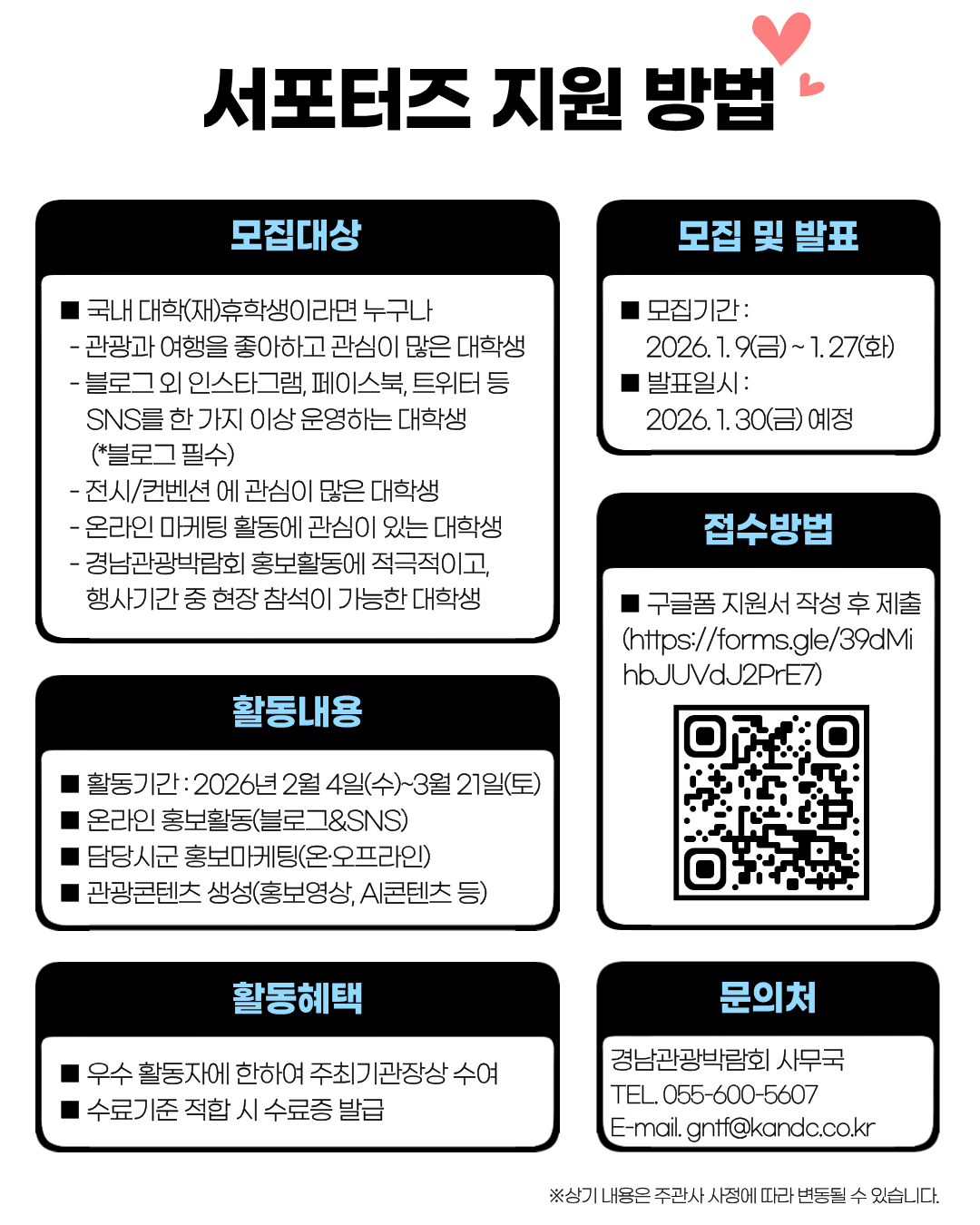 ■ 접수방법 : 구글폼 지원서 작성 후 제출(https://forms.gle/39dMihbJUVdJ2PrE7)