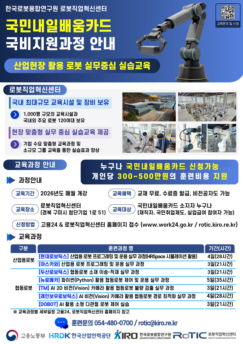 기업재직자 및 구직자분들의 로봇, 자동화, AI 역량강화를 위하여 국비지원 및 훈련비 환급 교육과정을 운영하오니 많은 관심과 신청 부탁드립니다.