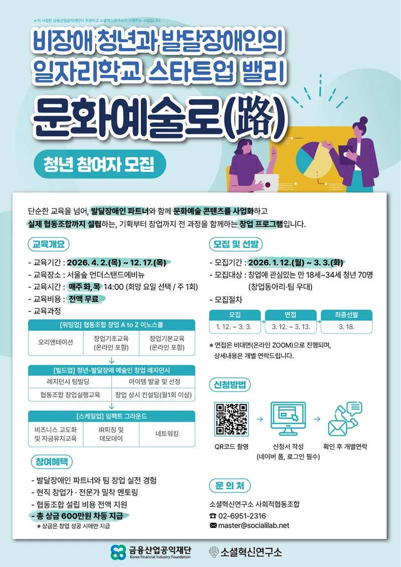 비장애청년과 발달장애인의 일자리 학교, 스타트업 밸리 『문화예술로(路)』 참여자 모집(~3/3)
