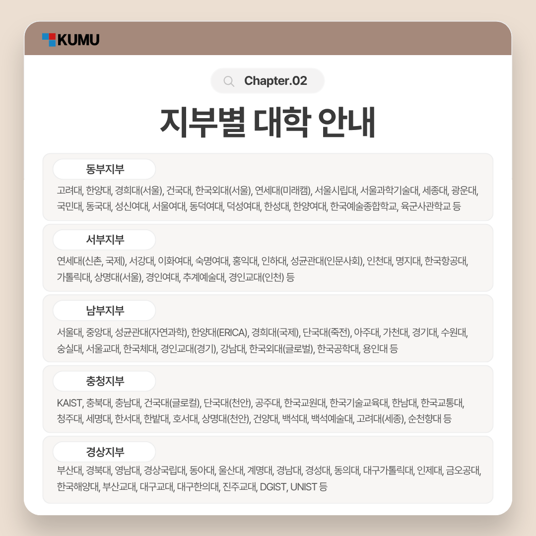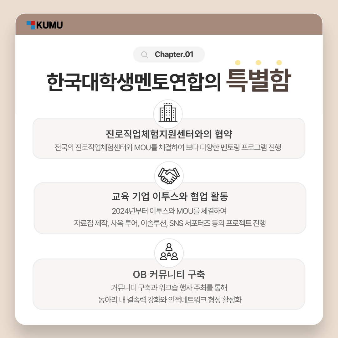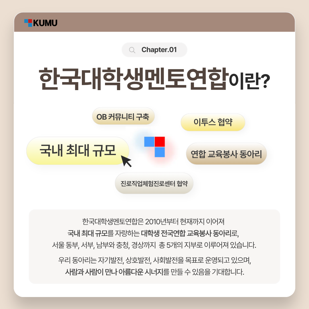 2010년, 중앙일보 <공부의 신 프로젝트> 우수 멘토들이 모여 출범한 ‘한국대학생멘토연합(KUMU)’은 '자기 발전, 상호 발전, 사회 발전'을 핵심 가치로 삼고 있는 전국 단위 교육기부 연합 동아리입니다.