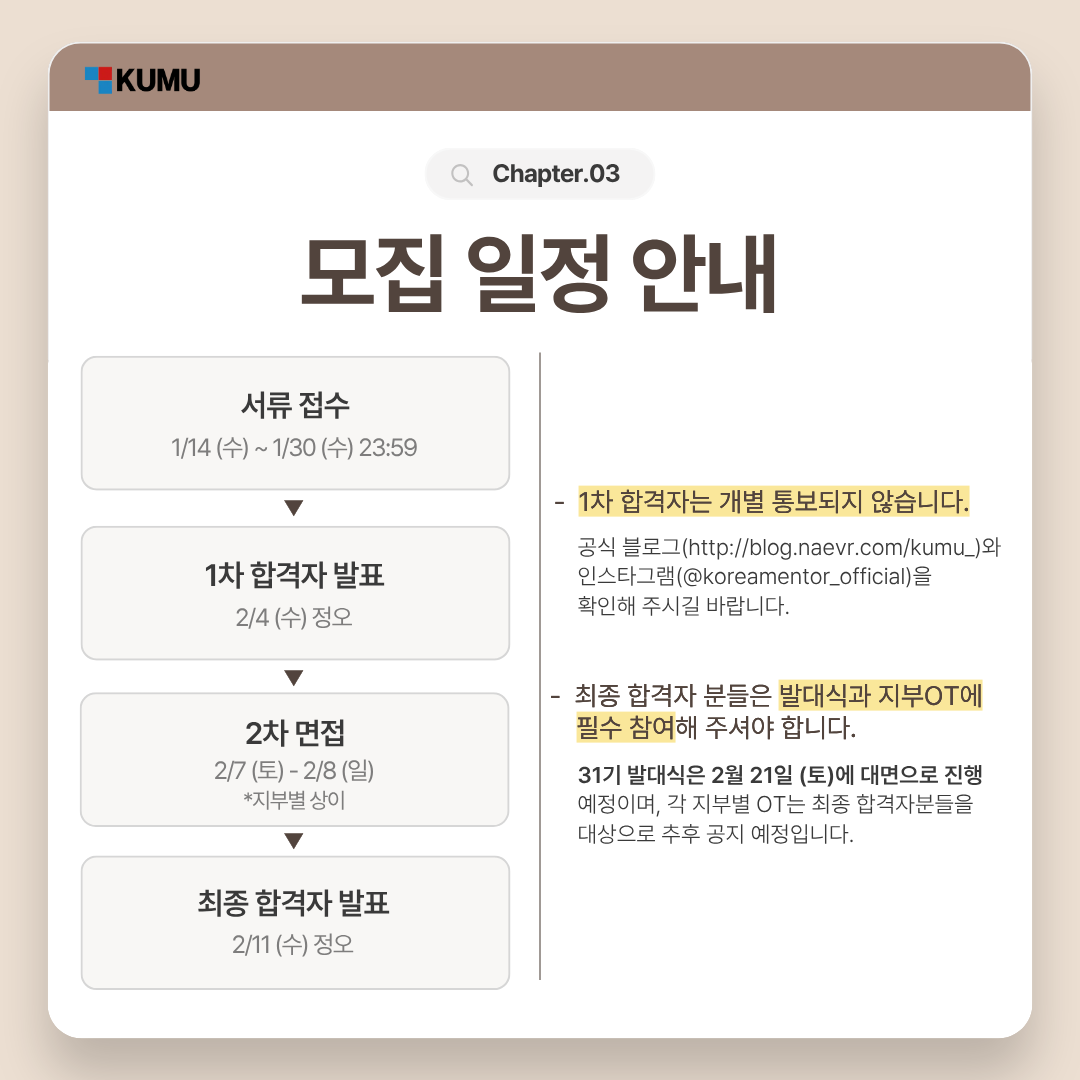 (※ 공식 블로그(http://m.blog.naver.com/kumu_) 및 인스타그램(@koreamentor_official)에 업로드 / 개별통보 X)