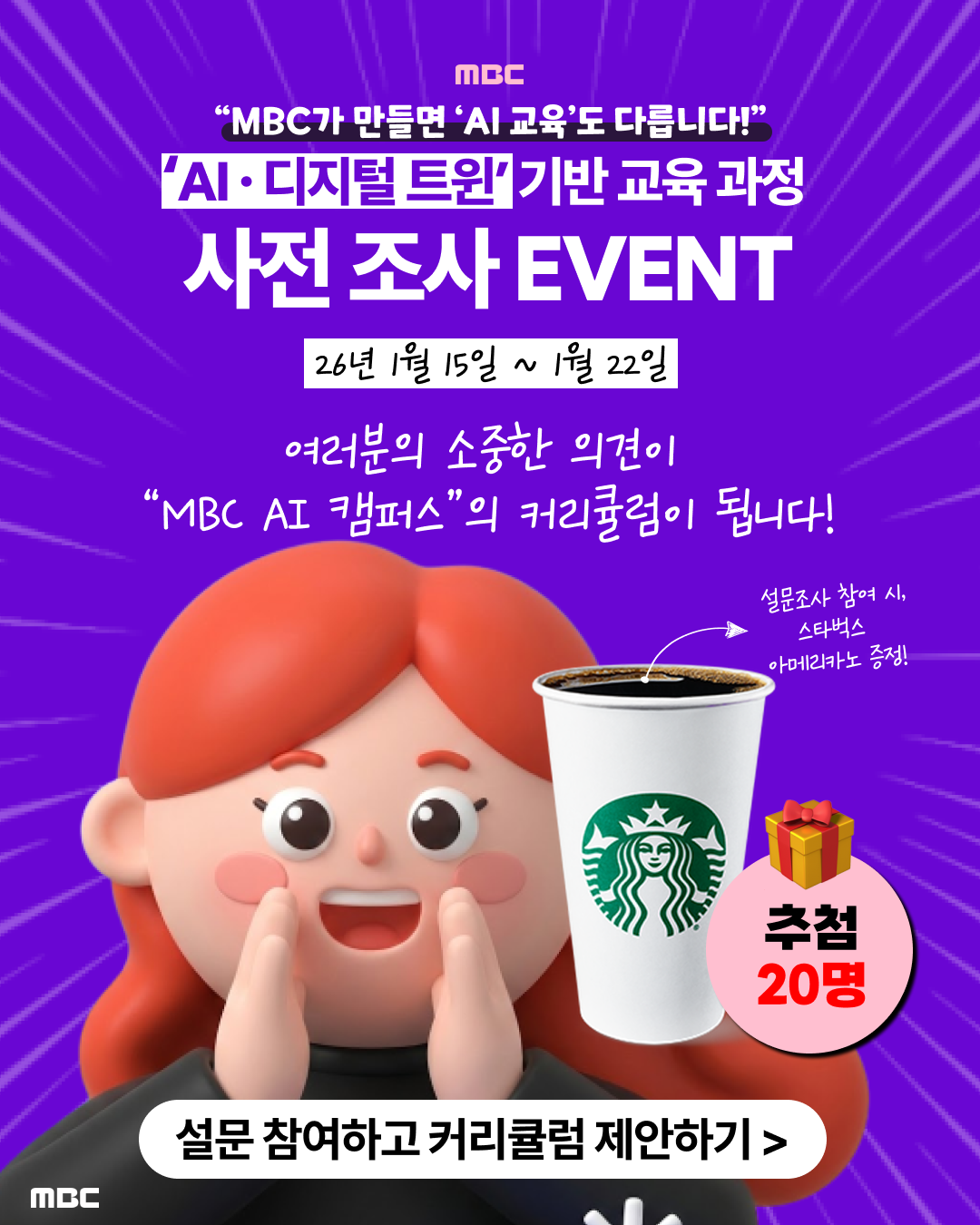 MBC에서 현장 맞춤형 'AI·디지털 트윈 아카데미' 교육생 모집에 앞서 수요조사를 진행합니다.