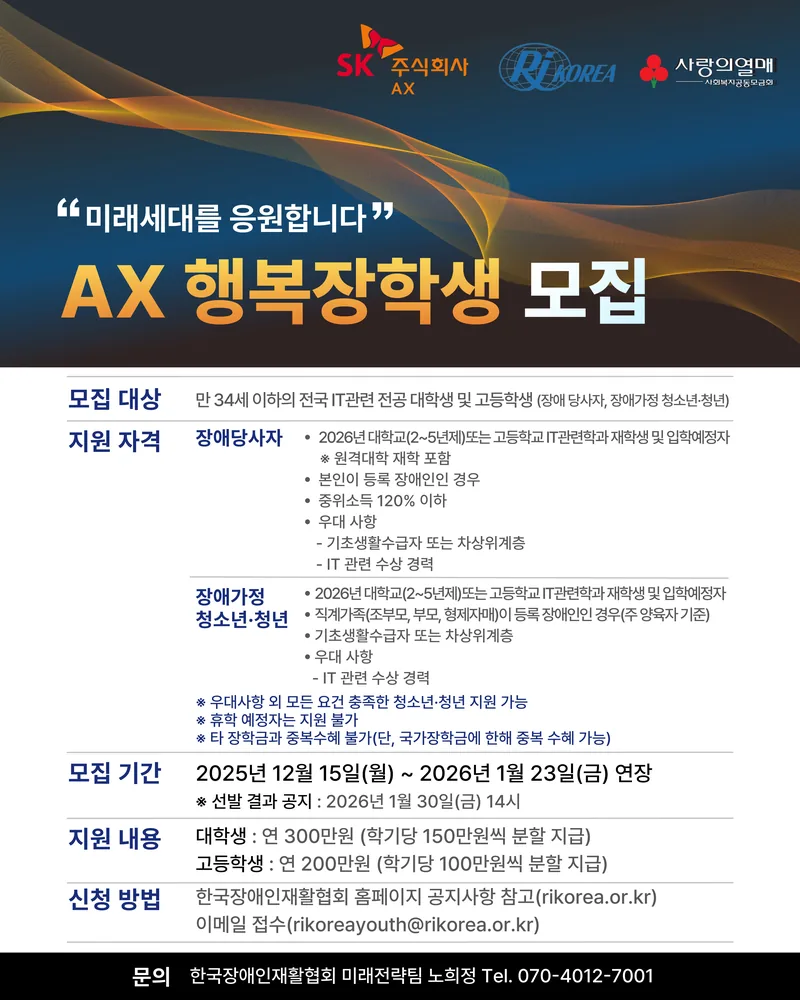 ![상단 오른쪽에 SK주식회사AX로고, RI KOREA로고, 사랑의열매 사회복지공동모금회 로고가 있다. 그 아래로 "미래세대를 응원합니다" AX 행복장학생 모집으로 제목이 적혀있다. <br /> ❏ 모집대상: 만 34세 이하의 전국 IT관련 전공 대학생 및 고등학생(장애당사자, 장애가정 청소년·청년)<br /> ❏ 지원자격<br /> [장애당사자]<br /> • 2026년 대학교(2~5년제) 또는 고등학교 IT관련학과 재학생 및 입학예정자 <br /> ※ 원격대학 재학 포함<br /> • 본인이 등록 장애인인 경우<br /> • 중위소득 120% 이하<br /> • 우대 사항<br /> - 기초생활수급자 또는 차상위계층<br /> - IT관련 수상 경력<br /> <br /> [장애가정 청소년·청년]<br /> • 2026년 대학교(2~5년제) 또는 고등학교 IT관련학과 재학생 및 입학예정자<br /> • 직계가족(조부모, 부모, 형제자매) 중 등록 장애인이 있는 경우(주 양육자 기준)<br /> • 기초생활수급자 또는 차상위계층<br /> • 우대 사항<br /> - IT관련 수상 경력<br /> <br /> ※ 우대사항 외 모든 요건 충족한 청소년·청년 지원 가능<br /> ※ 휴학 예정자는 지원 불가<br /> ※ 타 장학금과 중복수혜 불가(단, 국가장학금에 한해 중복 수혜 가능)<br /> <br /> ❏ 모집기간: 2025년 12월 15일(월)~2026년 1월 23일(금) ※선발 결과 공지 : 2026년 1월 30일(금) 14시<br /> <br /> ❏ 지원내용 <br /> • 대학생: 연 300만원(학기당 150만원씩 분할 지급)<br /> • 고등학생: 연 200만원(학기당 100만원씩 분할 지급)<br /> <br /> ❏ 신청 방법<br /> 한국장애인재활협회 홈페이지 공지사항 참고(rikorea.or.kr), 이메일 접수(rikoreayouth@rikorea.or.kr)<br /> <br /> ❏문의 : 한국장애인재활협회 미래전략팀 노희정 Tel. 070-4012-7001](https://rikorea.or.kr/wp-content/uploads/kboard_attached/10/202601/69698904228146467961.jpg)