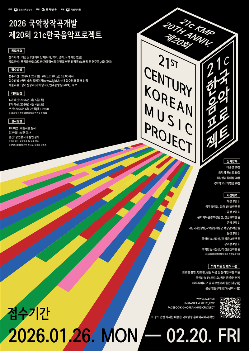 - 1차 예선(제출서류 심사) : 2026년 3월 5일(목) / 국악방송 대회의실 (비공개)