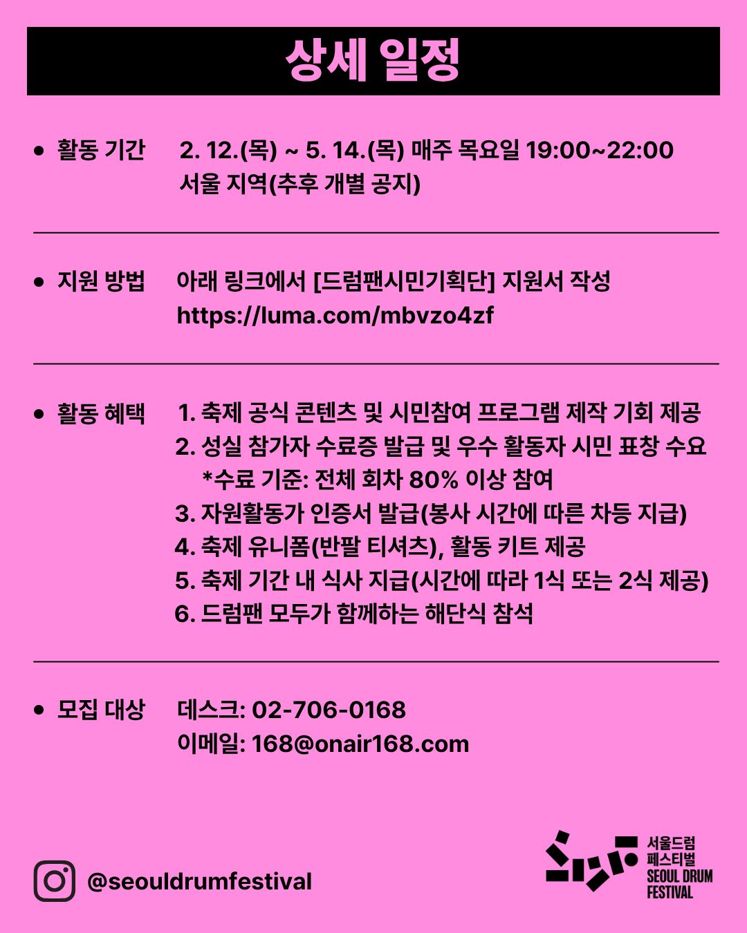 축제 홍보부터 기획까지, 서울의 리듬을 함께 만들 드럼팬을 기다립니다!☺️😉