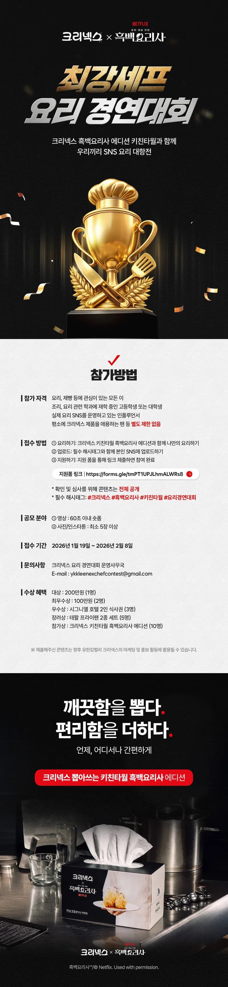 필수 해시태그: #크리넥스 #흑백요리사 #키친타월 #요리경연대회