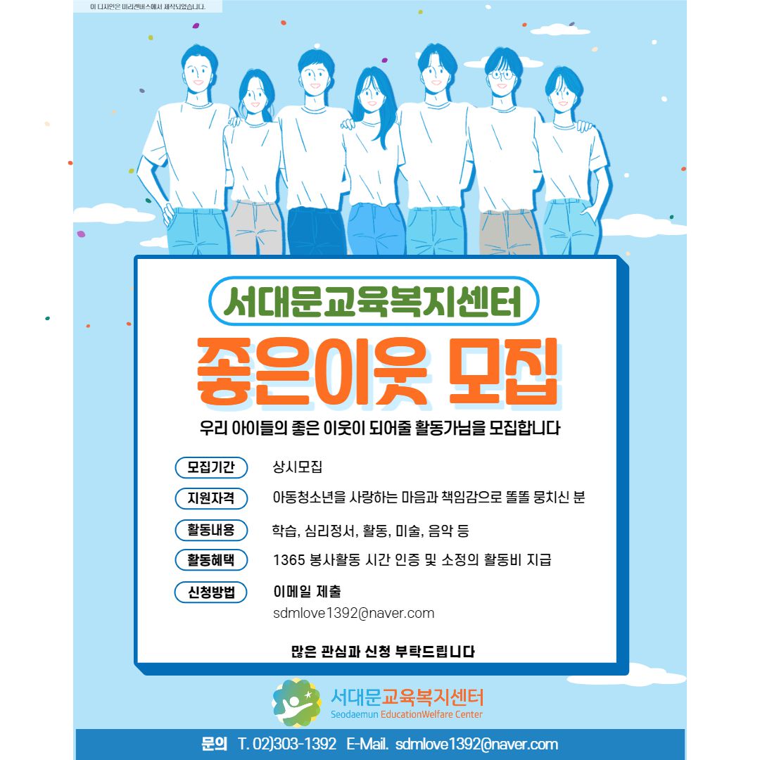 서대문교육복지센터 '좋은이웃' 자원활동가 분들을 모집합니다~!