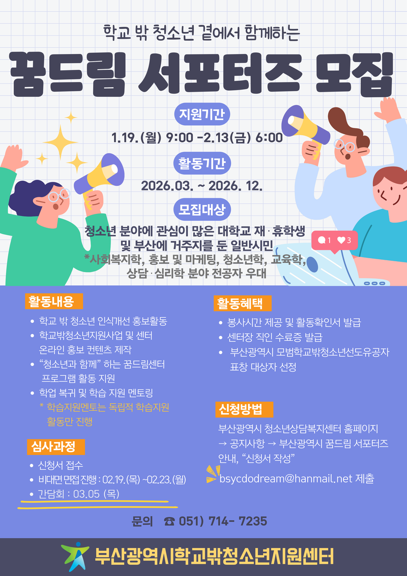 - 부산광역시학교밖청소년지원센터 꿈드림 서포터즈단을 모집합니다.