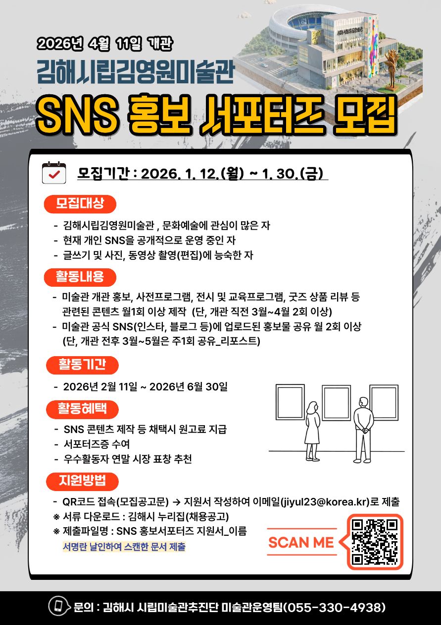 2026년 4월 11일 개관 예정인 “김해시립김영원미술관”에서 첫 서포터즈를 모집합니다.