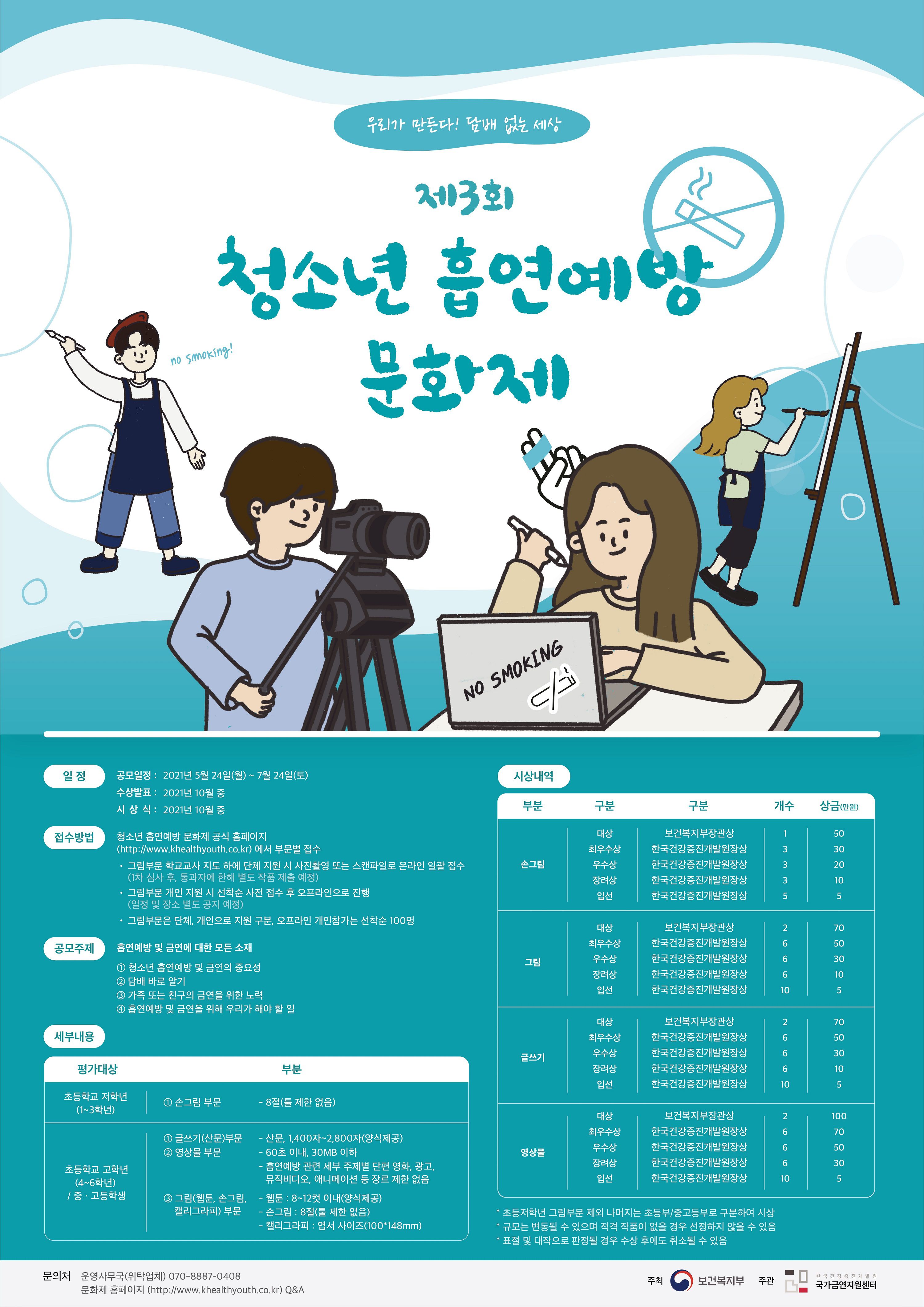 - 흡연예방 관련 세부 주제별 단편 영화, 광고, 뮤직비디오, 애니메이션 등 장르 제한 없음