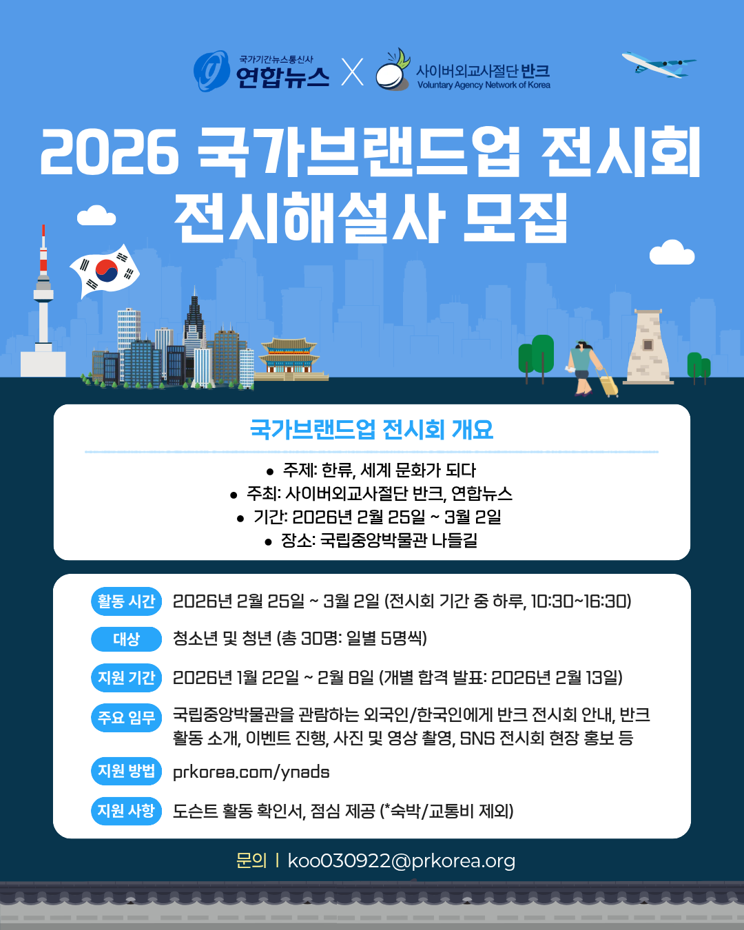 사이버외교사절단 반크와 연합뉴스가 함께하는 '국가브랜드업 전시회' 전시 해설사를 모집합니다.