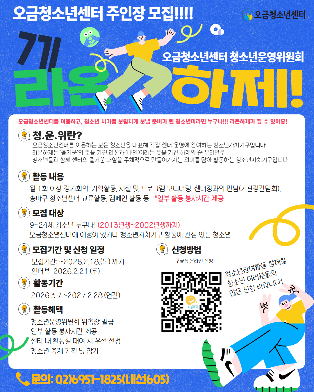 청소년이 주체적으로 청소년시설 운영 및 프로그램에 대해 모니터링과 함께 다양한 의견 및 요구를 제안함으로써 청소년시설 운영의 효율성을 높이고자 『제 7기 오금청소년센터 청소년운영위원회“라온하제”』를 모집하오니 관심 있는 청소년들의 많은 참여 부탁드립니다.