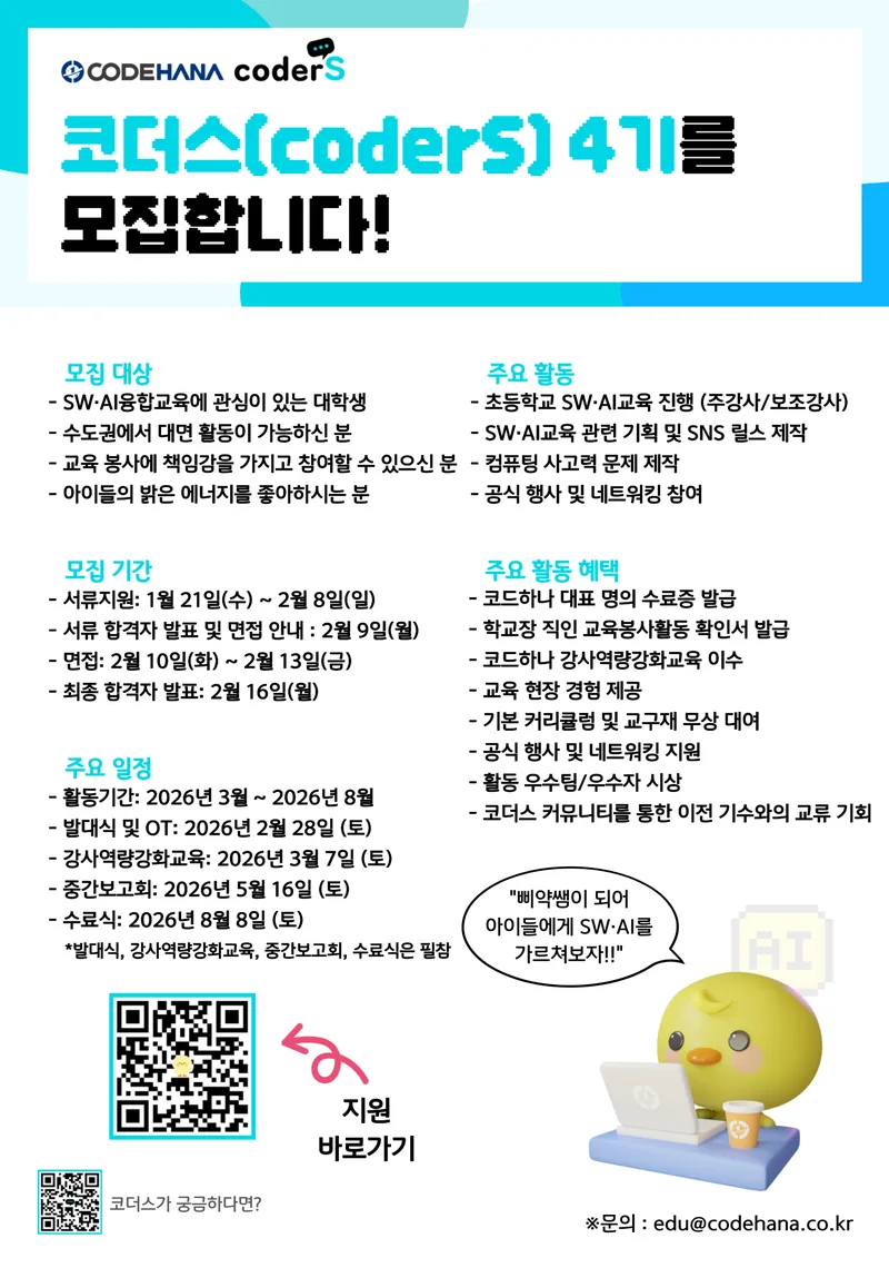 (주)코드하나에서 SW·AI 교육서포터즈 코더스(coderS) 4기를 모집합니다.