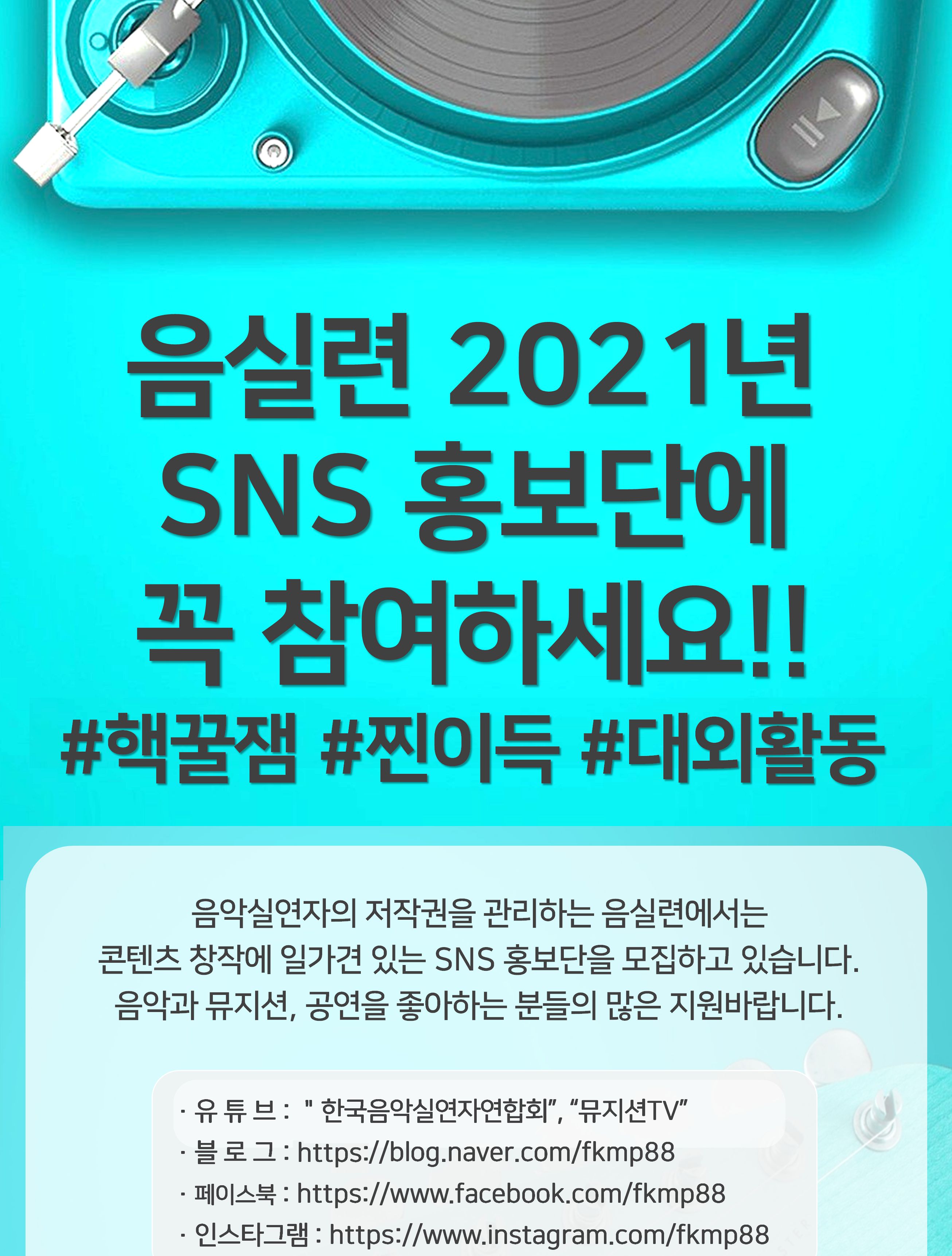 음악실연자의 저작권을 관리하는 음실련에서는 콘텐츠 창작에 일가견 있는 SNS 홍보단을 모집하고 있습니다.