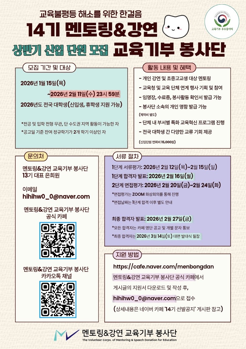 λ©λ΄λ¨ 곡μ μΉ΄ν '14κΈ° μ λ° κ³΅μ§' μΉ΄ν κ³ λ¦¬ κ²μκΈ μ€ '2026λ λ 14κΈ° μ μ λ¨μ μ λ°κ³΅κ³ λ° μ§μμ' νμΈ