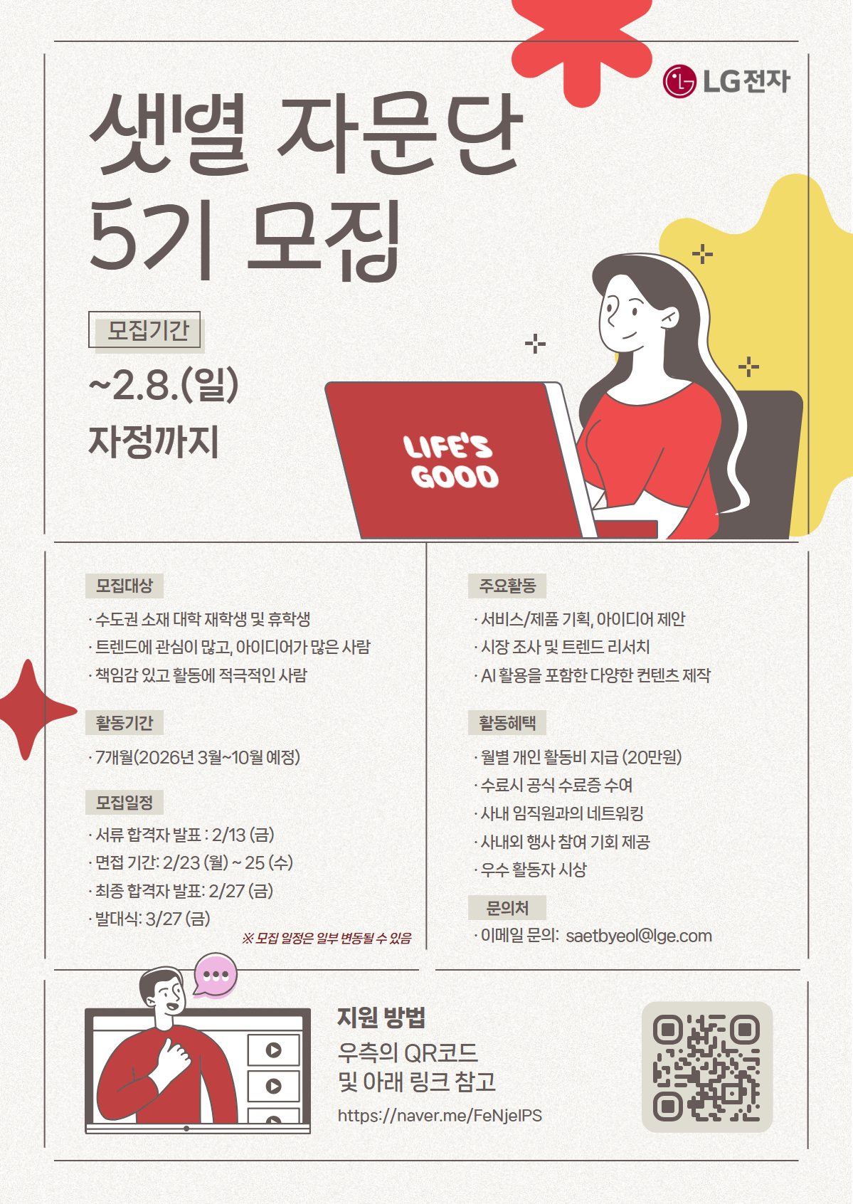 LG전자 MS사업본부 샛별자문단 5기 모집 샛별자문단은 LG전자 MS사업본부의 서비스/제품에 관련된 아이디어를 제안하고, 트렌드를 리서치하며 다양한 컨텐츠를 제작하는 대외활동입니다.