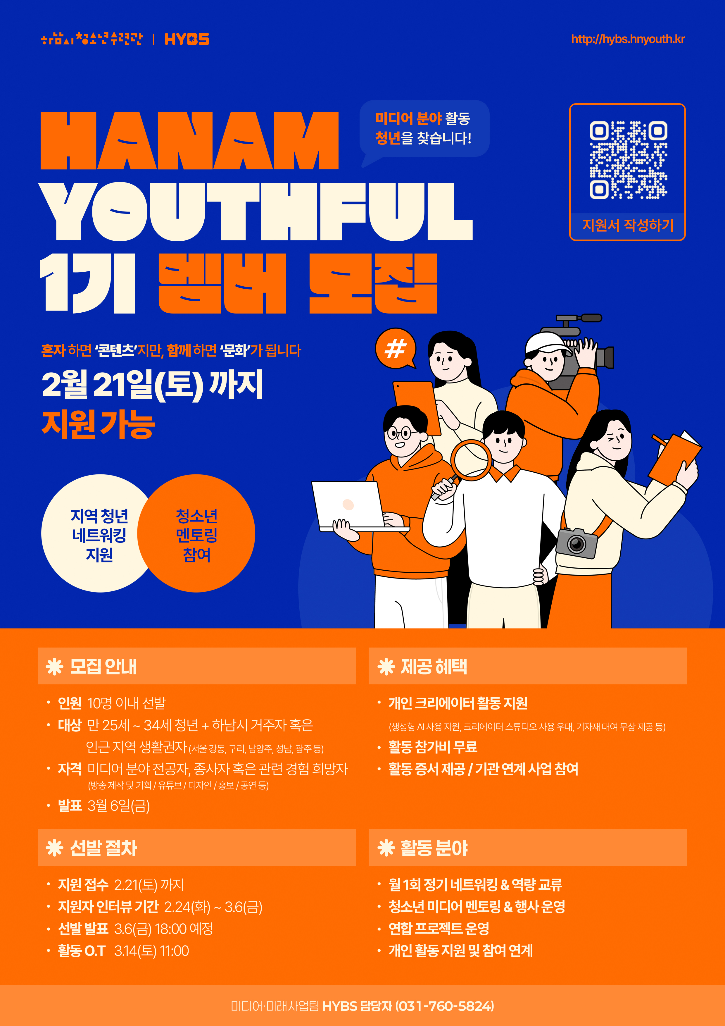 하남시청소년수련관 HYBS에서 2026년 한 해동안 네트워킹 및 연합 프로젝트를 함께할 'YOUTHFUL HANAM' 1기 멤버를 모집합니다.