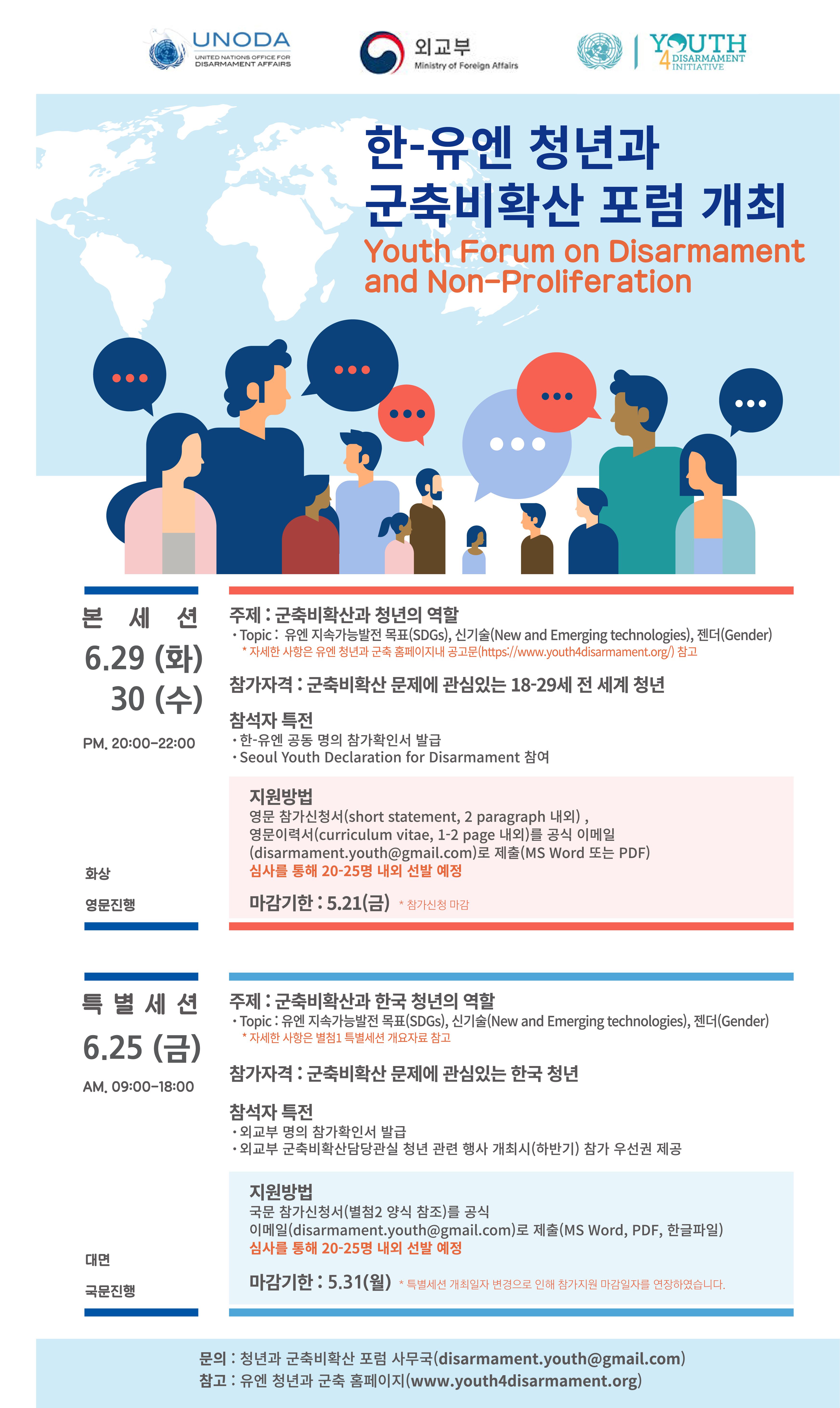 우리나라 외교부와 UN 군축실이 공동개최하는 "한-유엔 청년 군축비확산 포럼"의 특별세션 참가자를 모집합니다.