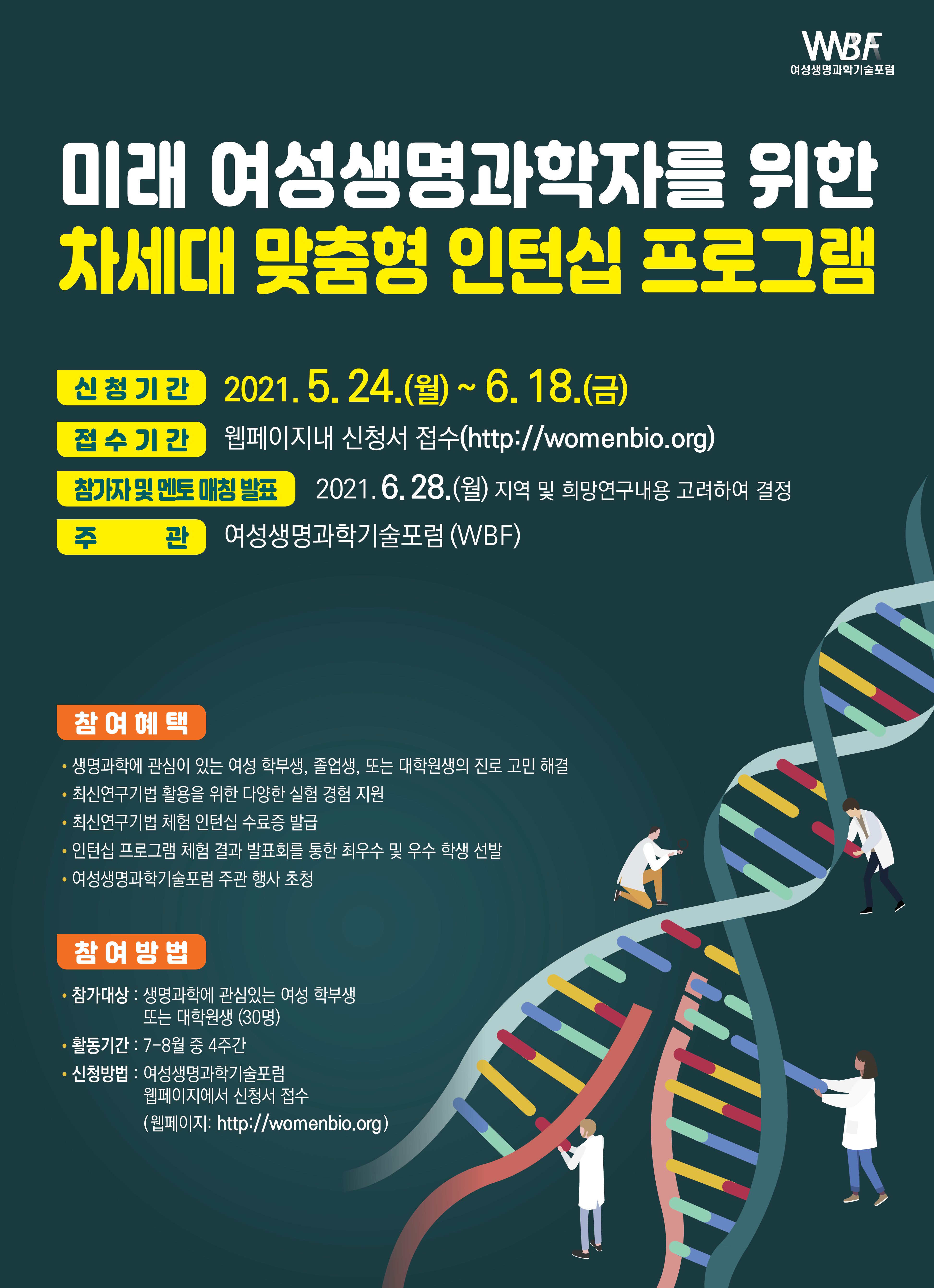 여성생명과학기술포럼에서 학부생, 대학원생를 위한 생명과학분야 인턴십 프로그램을 진행합니다.
