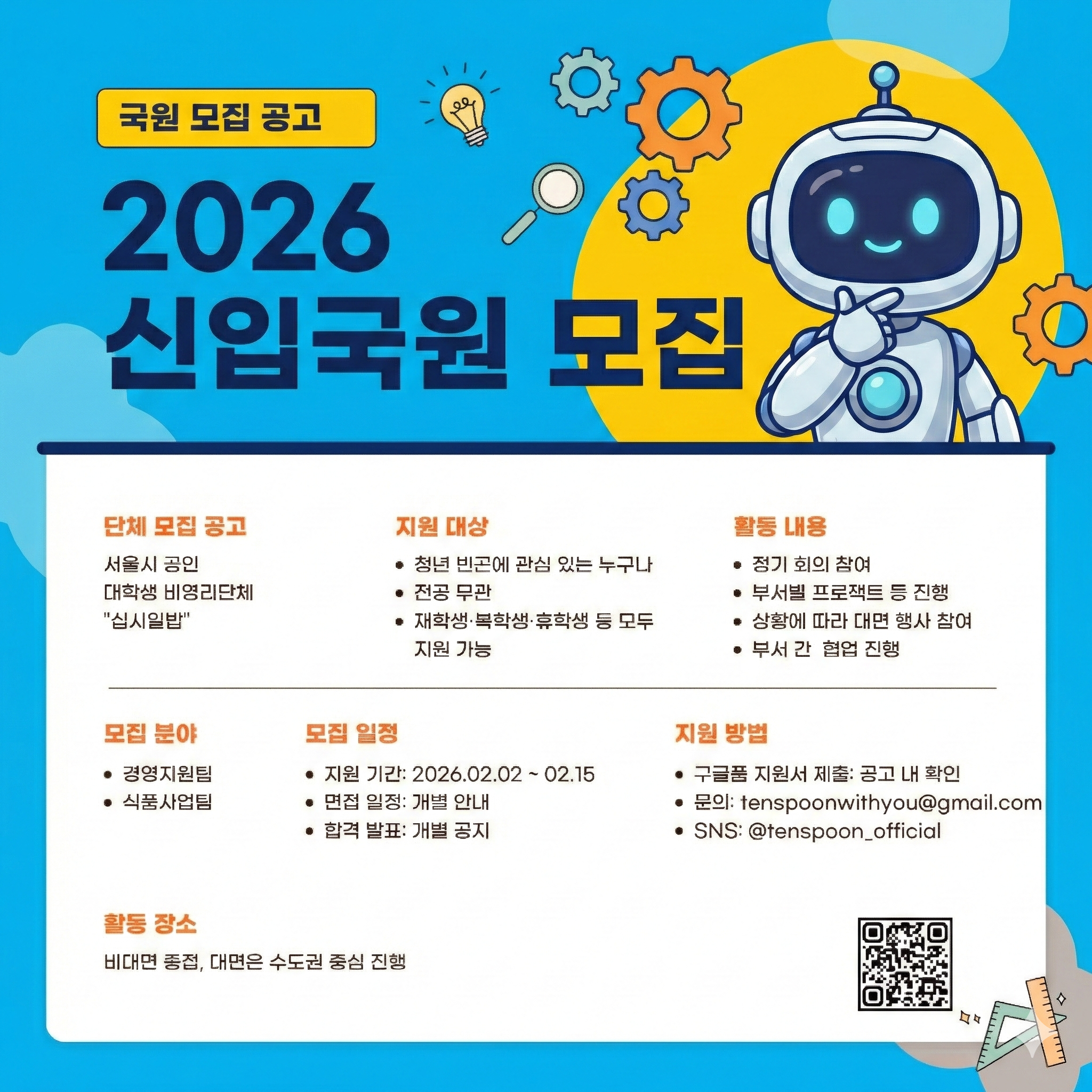 현재 150여 명 이상의 봉사자와 함께 전국 대학생 대상 식권 나눔 프로젝트를 운영하고 있으며, 함께 성장해 나갈 새로운 사무국원을 모집합니다.