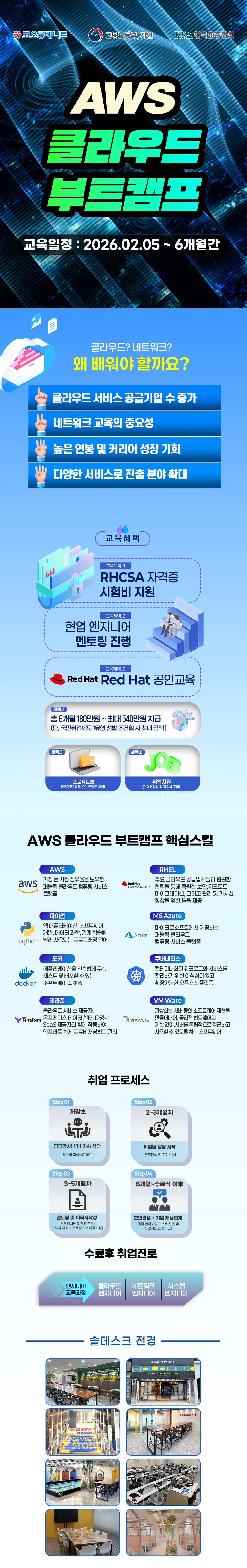 - 비전공자도 체계적인 학습을 통해 IT 인프라 엔지니어로 성장할 수 있는 국비지원 클라우드 취업 교육 과정입니다.