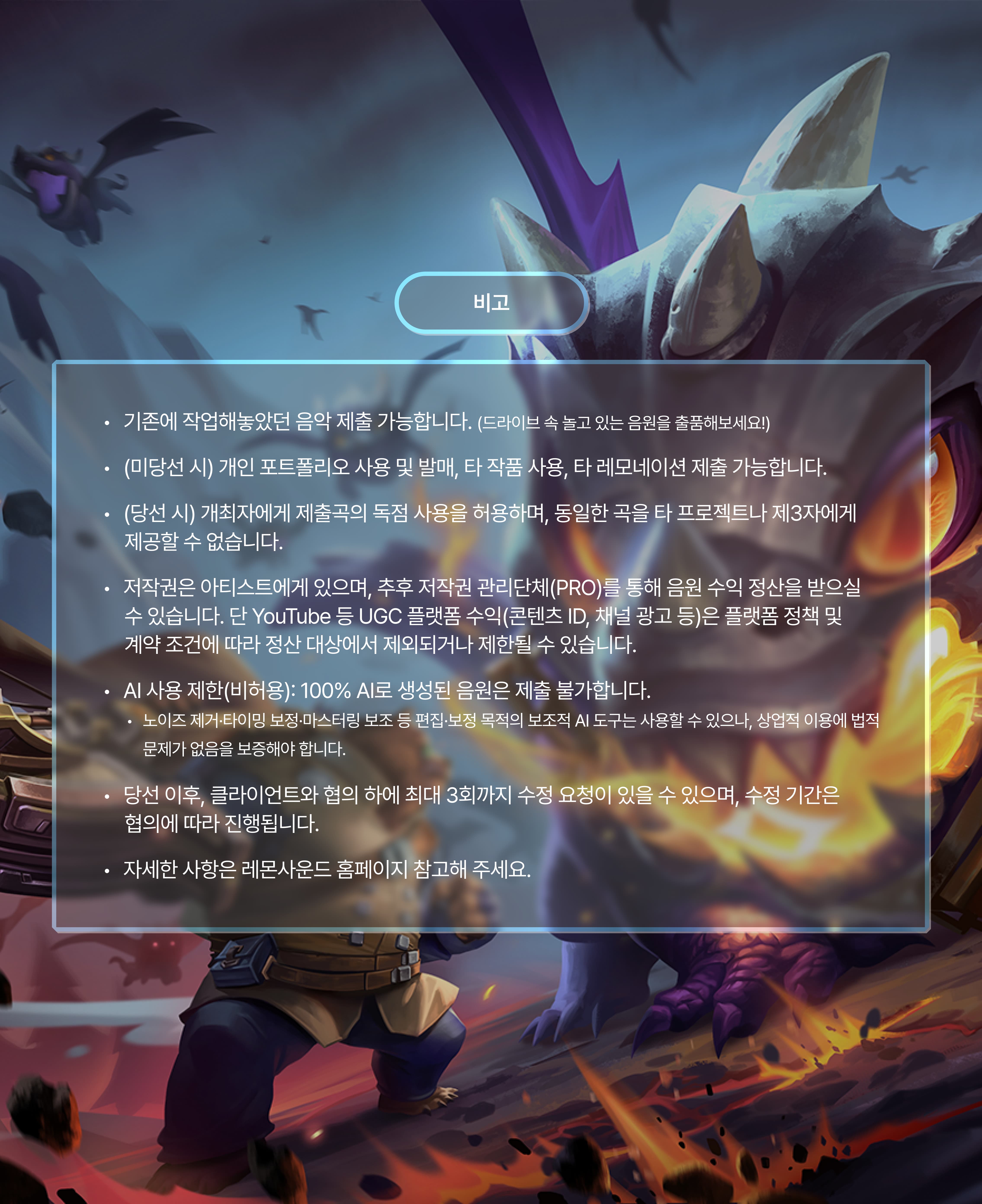 곡 접수 기간 : ~2026년 3월 31일 23시 59분 (KST)접수 방법 : 레몬사운드 홈페이지 내 ‘레모네이션’작품 길이 : 2-5분 내외작품 규격 : .mp3 또는 .wav