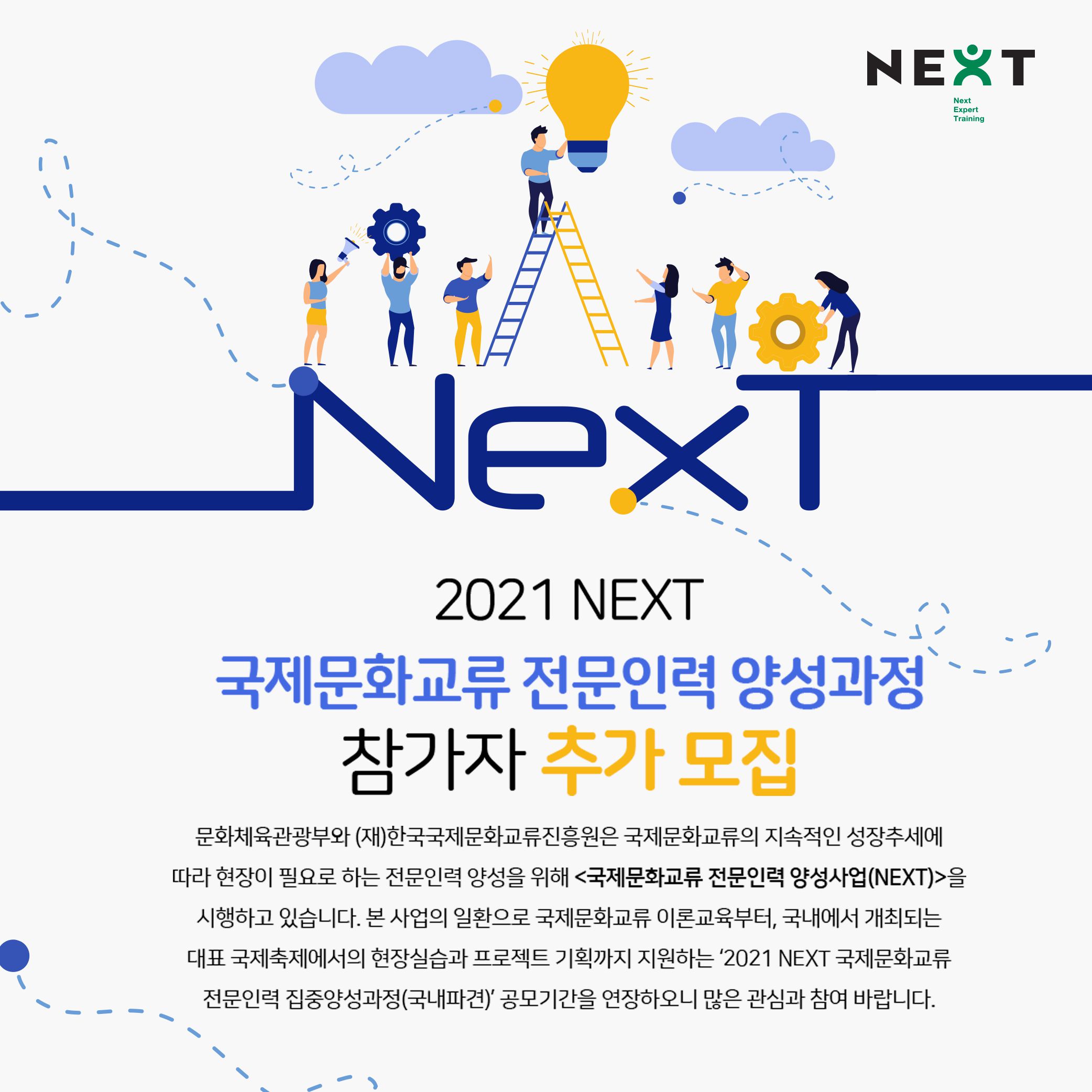 진흥원에서는 국제문화교류의 지속적인 성장추세에 따라 현장이 필요로 하는 전문인력 양성을 위해 <국제문화교류 전문인력 양성사업(NEXT)>을 시행하고 있으며,