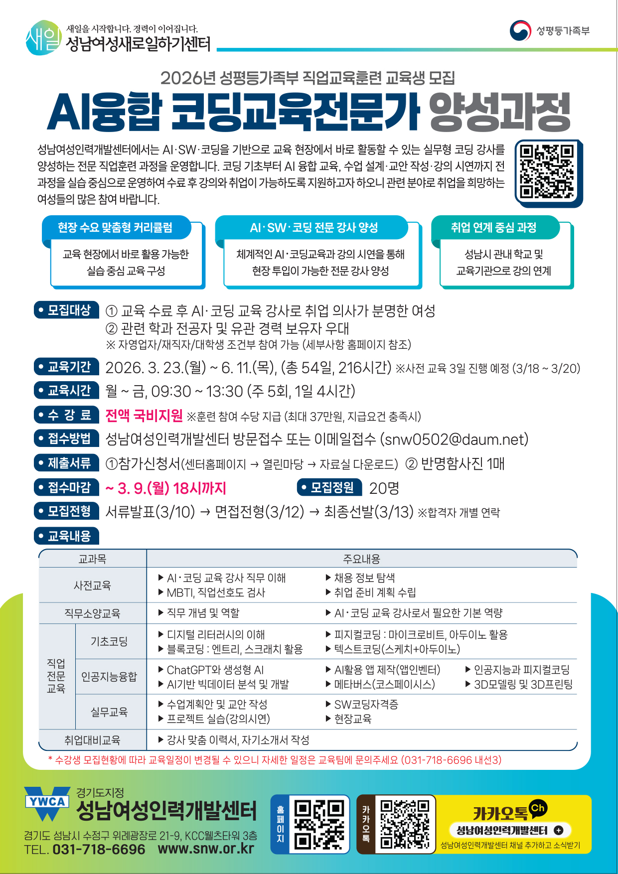 - AI/SW/코딩 교육 강사로 취업의사가 분명하고 훈련에 적극적으로 참여하고자 하는 성남시 및 인근지역 거주 여성