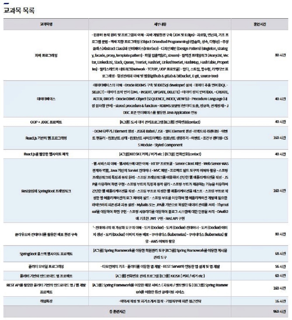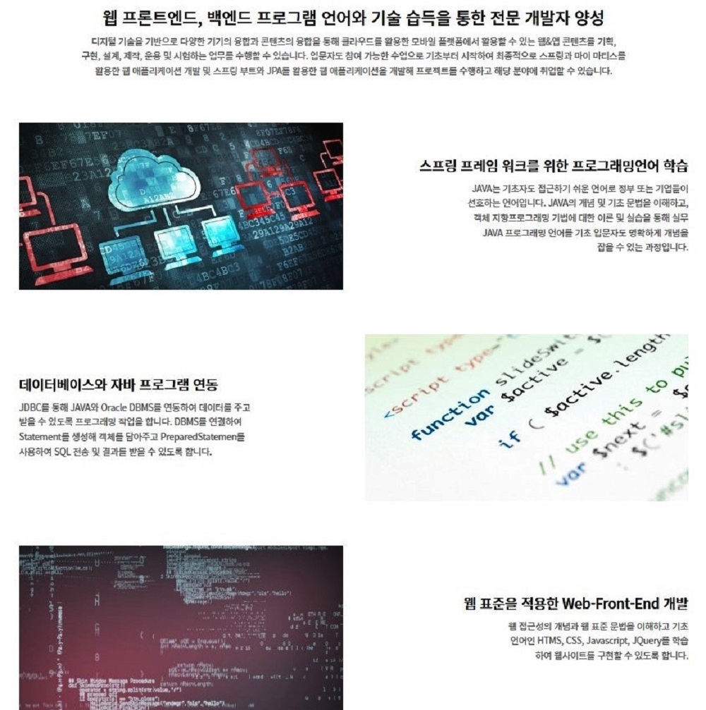 - 웹 프론트엔드, 백엔드 프로그램 언어와 기술 습득을 통한 전문 개발자 양성