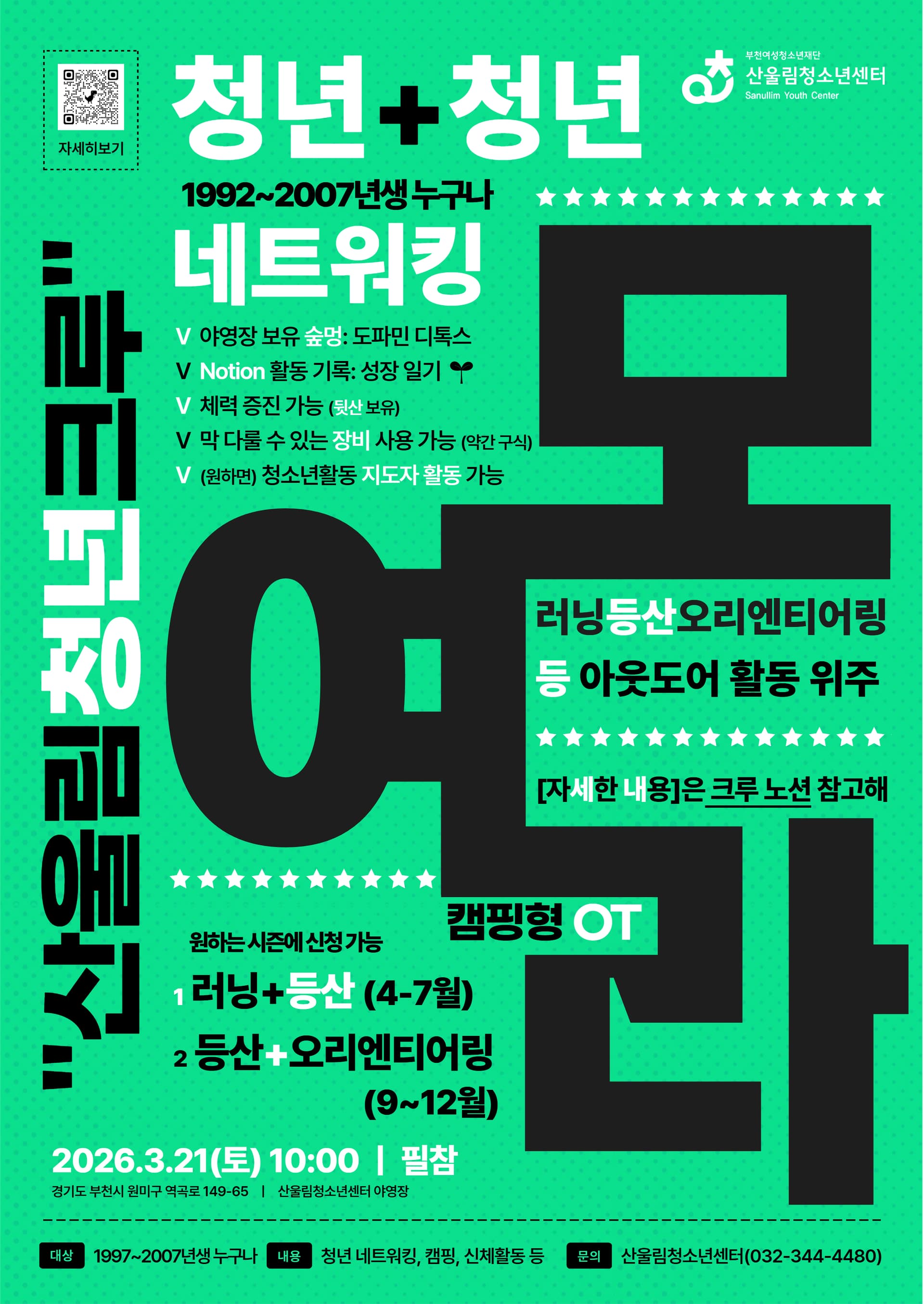OT 일시: 2026년 3월 21일(토) 10:00 (캠핑형 OT로 진행!) → 이후 신청 시 개별 OT 진행 예정
