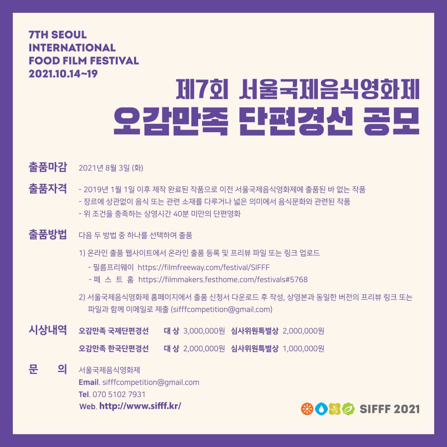 - 2019년 1월 1일 이후 제작 완료된 작품으로 이전 서울국제음식영화제에 출품된 바 없는 작품