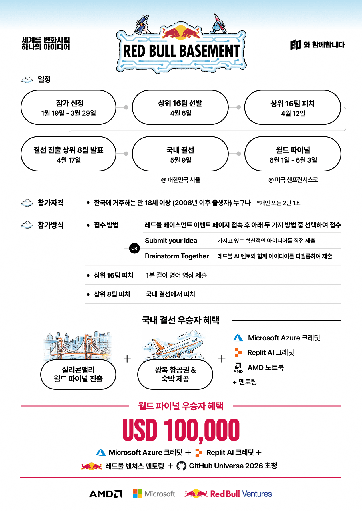 - 1차 접수 (~03/29): 레드불 홈페이지를 통한 아이디어 원페이저(One-pager) 제출